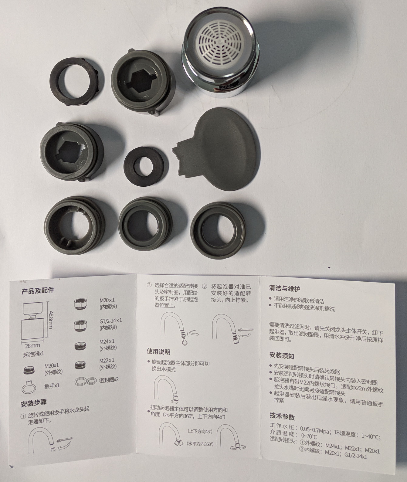 发泡器一个小包,配件一个小包,说明书一张,配件比较齐全,整个安装过程不需要另外的工具。使用过程调节也便捷,轻轻一拧发泡器,就可以变换出水方式。