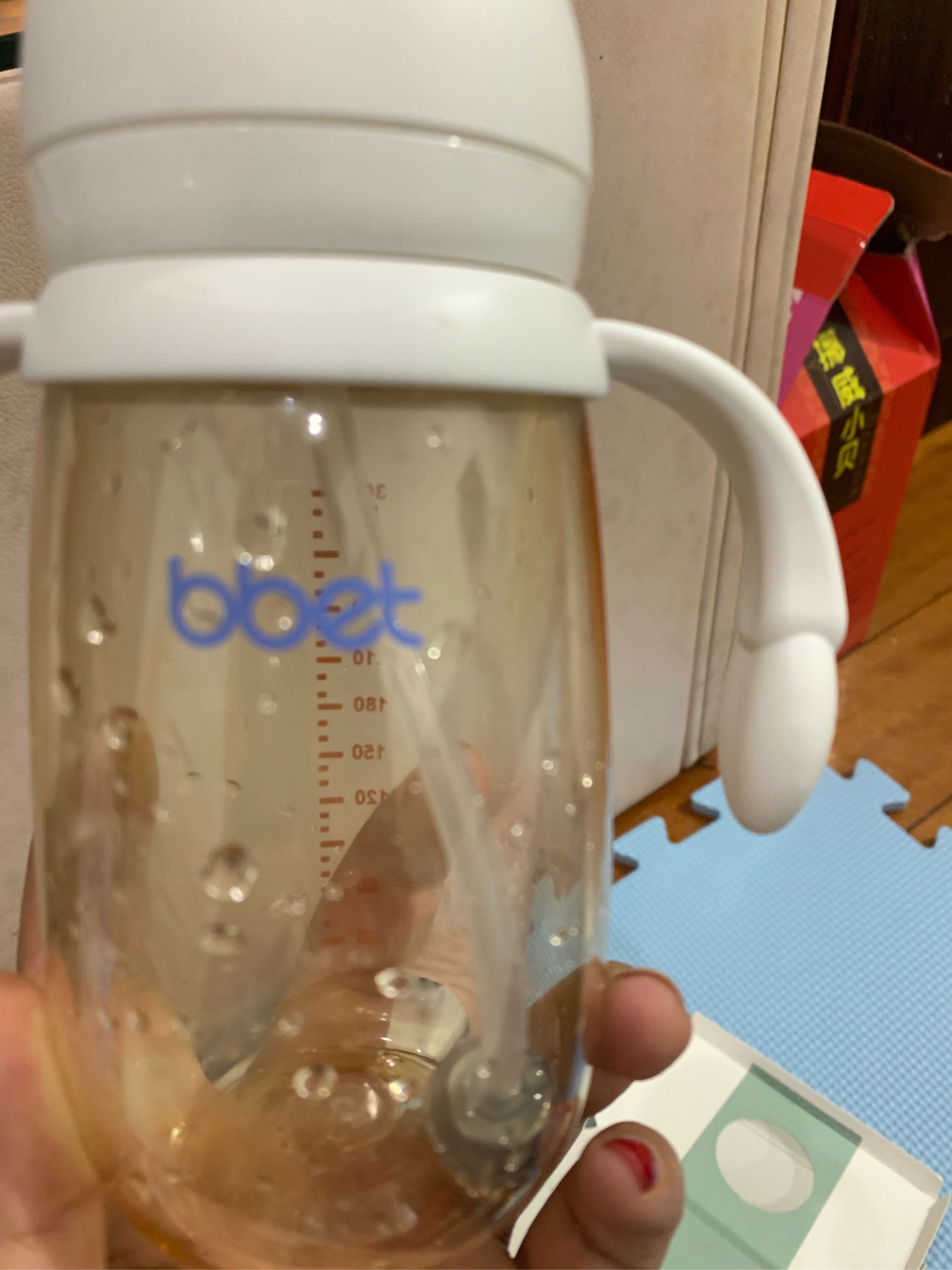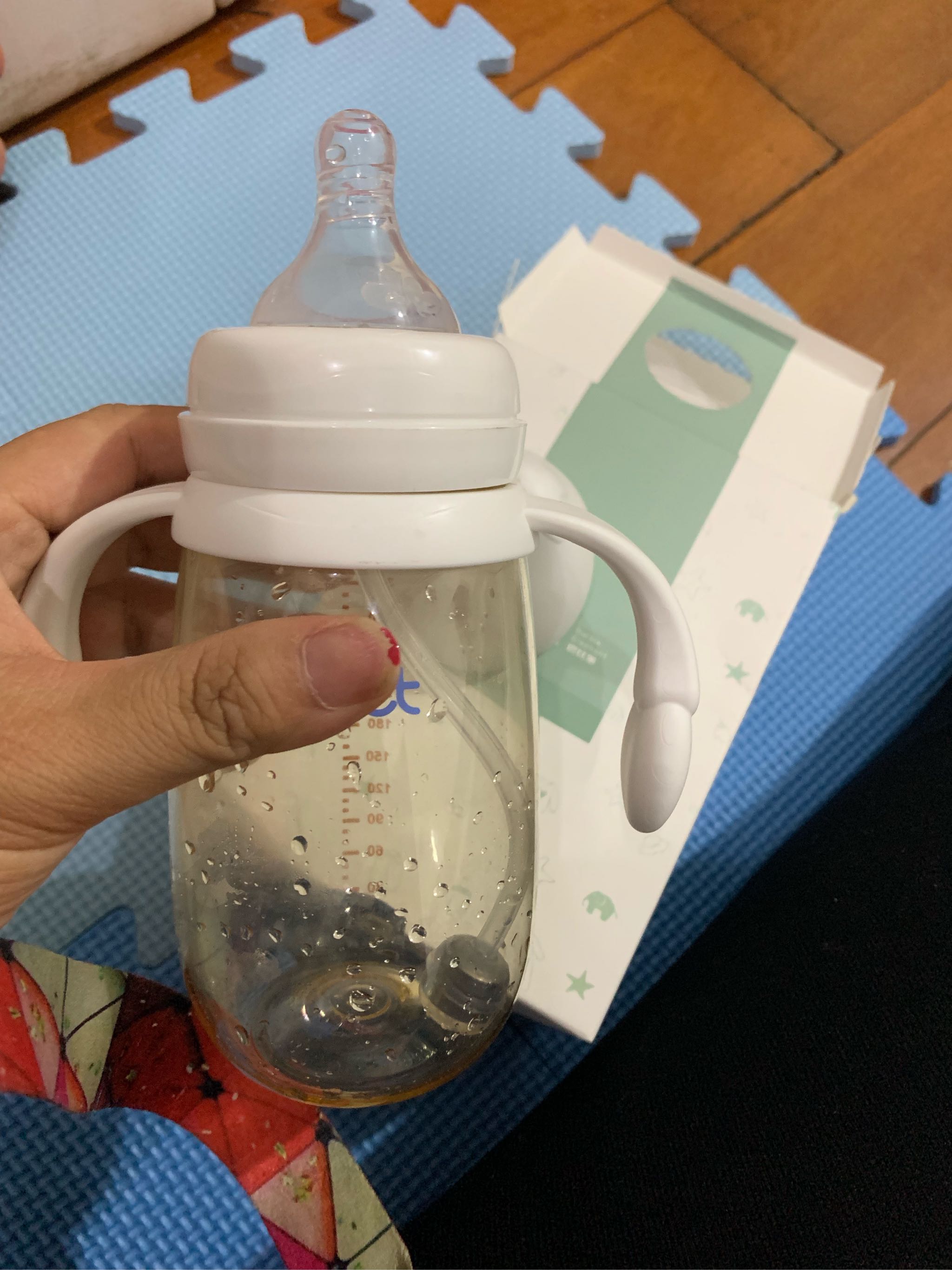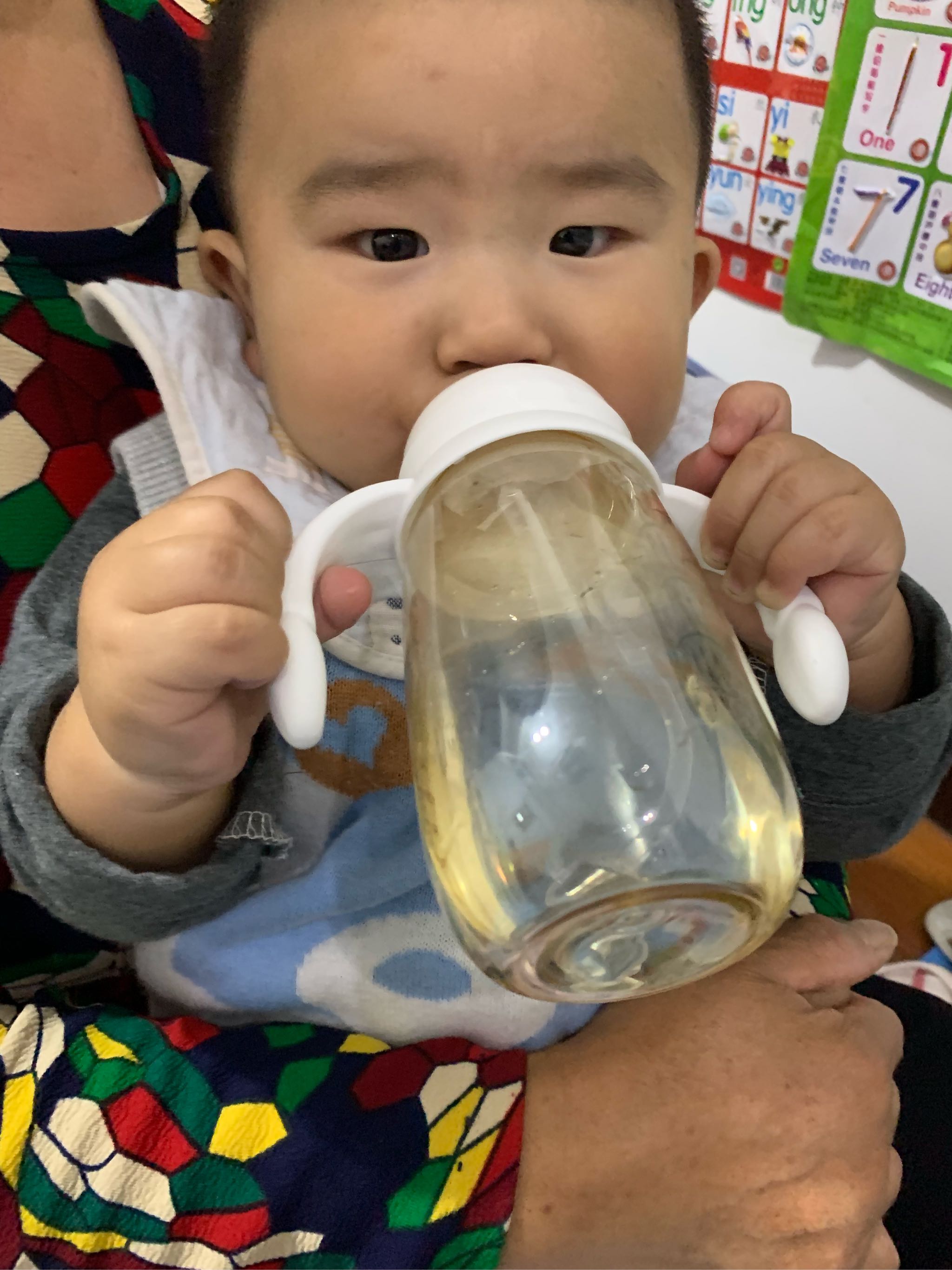 一收到货,感觉拿着很轻便,消毒后马上给宝宝使用,他自己拿着奶瓶喝很顺手,不用我一直扶着奶瓶,里面还装有一套洗刷工具和备用奶嘴,很贴心 这款奶瓶我用了好久,不易摔坏,而且奶头不容易破,我妈最喜欢用这款