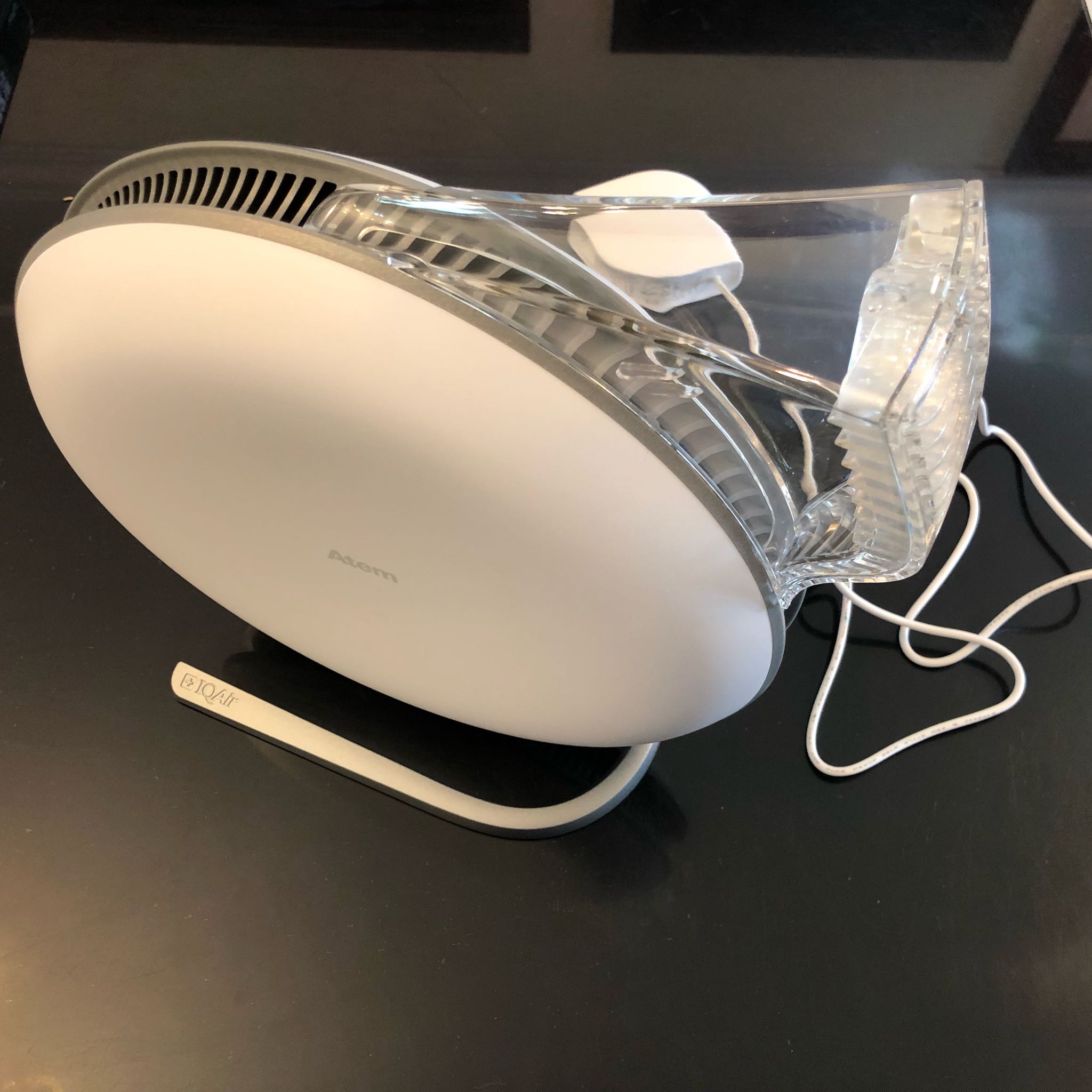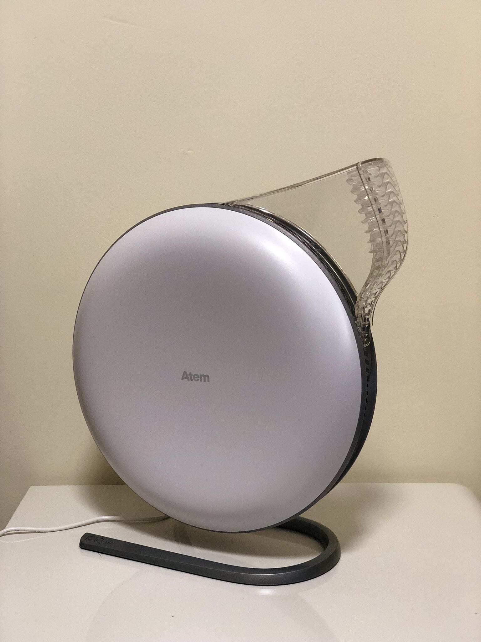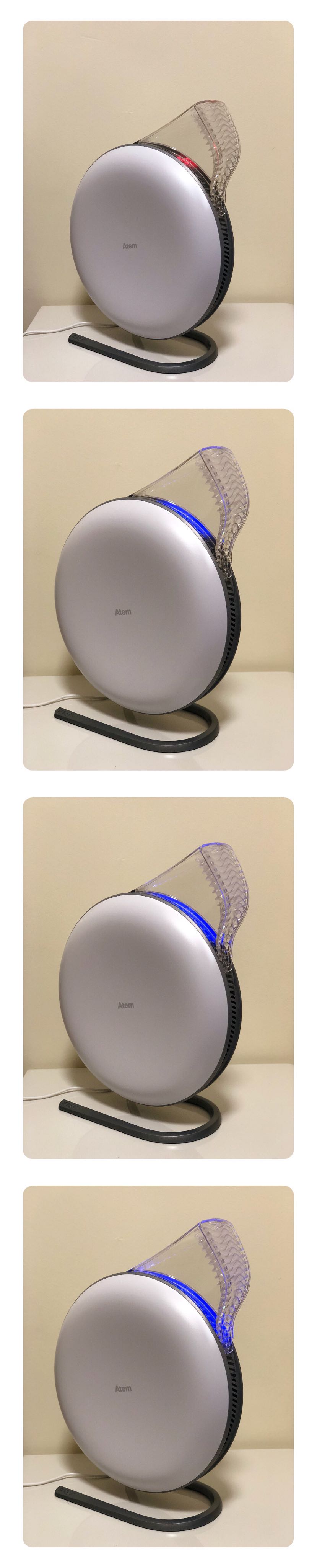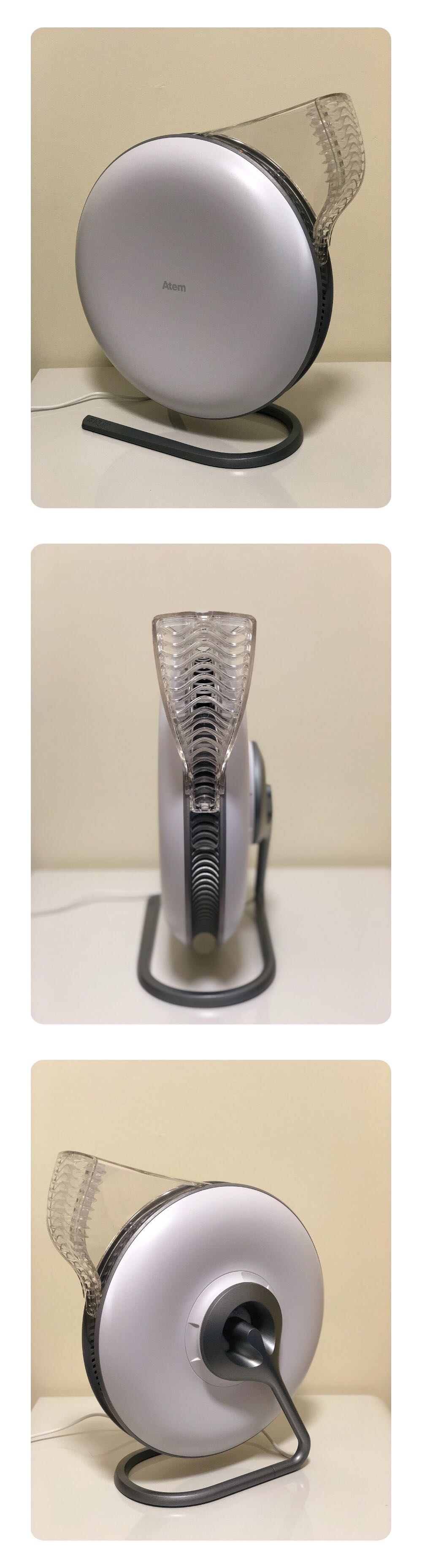 整机没有一个实体按键,侧面的 atem 字母为触控位置。可以通过旋转方式调节出风口位置。出风口有一个经过特殊设计的扩散器,能够阻止洁净空气与周围的污染空气混合,确保你前面的空气都是干净清洁的,但又不会感觉到太强的气流。