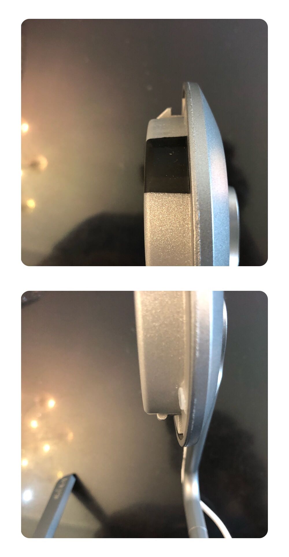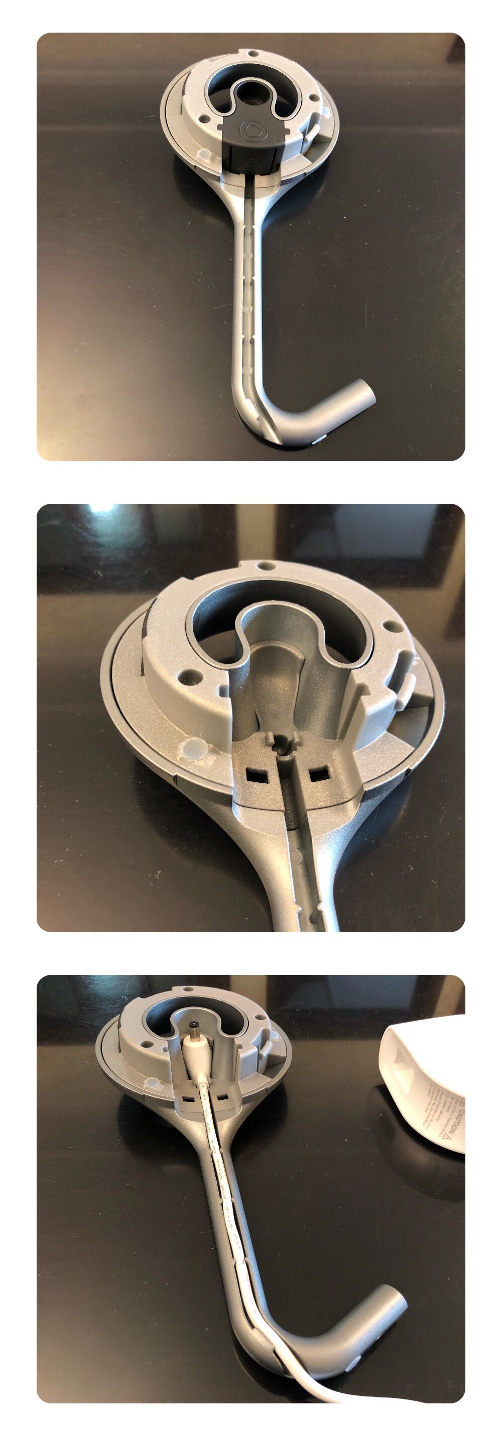工业设计堪称完美。从支架中的电源线卡槽的设计就可见一斑。