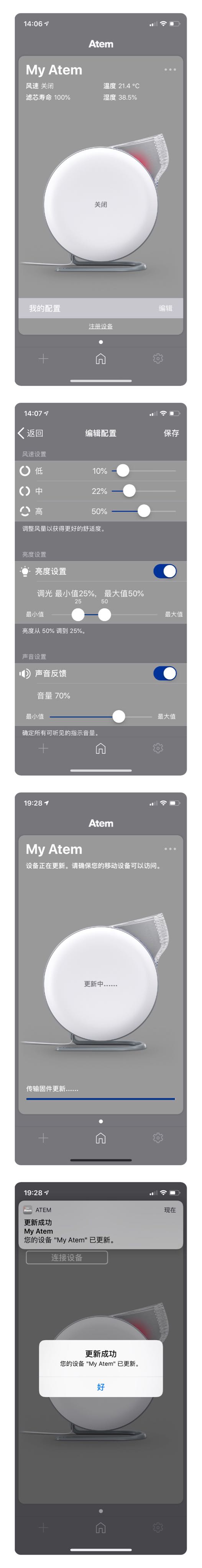 可以通过手机蓝牙用Atme app连接主机。可以看到当前净化器位置的温度与温度,还可以通过app对机器进行更适合自己的设置。同时也可以设置为自动开机与关机(机器接收手机蓝牙后app启动机器,蓝牙范围断开机器关机)。这些设置都充分的体现出了产品定位,个人专属空气净化器。