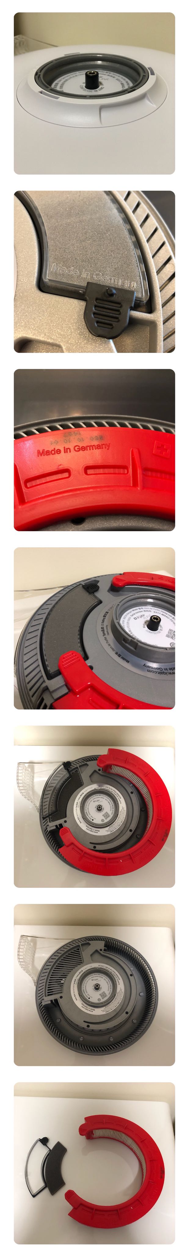 前面提到的工业设计堪称完美。旋转主机侧面的盖锁环就可以轻松打开盖板,对滤芯进行更换。可以看到滤芯边缘有方便提起滤芯的小条,黑色海绵部分可以理解为滤音部分,同样也带一个方便取出的小条。滤音部分与滤芯都印有德国制造,同样在底座底部也带有德国制造的英文标示。c型滤芯的设计可以增大空气净化器的进气量同时可以更大程度的主动过滤空气。