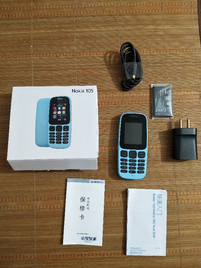 先来张全家福,包括手机,充电线,充电器,电池一块,保修卡,快速入门说明书一张(卖家还发有取卡针,屏幕保护膜,手机透明套,想得相当贴心)。发来的手机是天蓝色的,四角圆润,配上黑色的软按键,看起来相当活泼可爱。