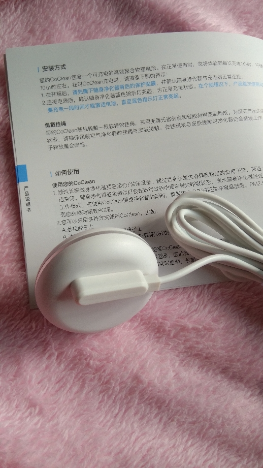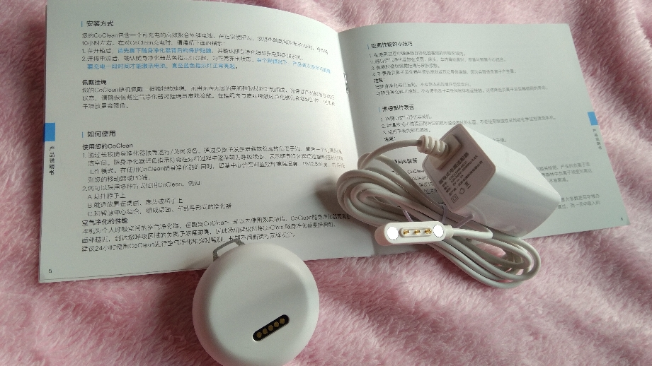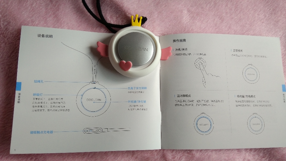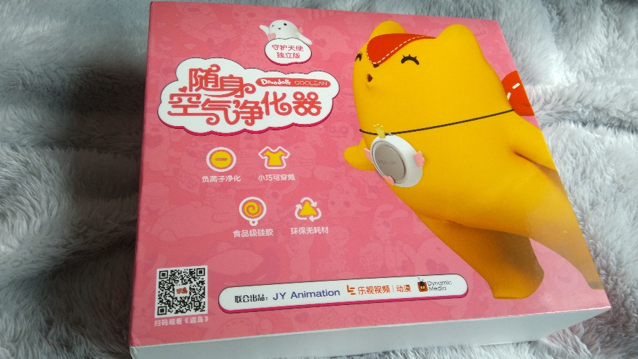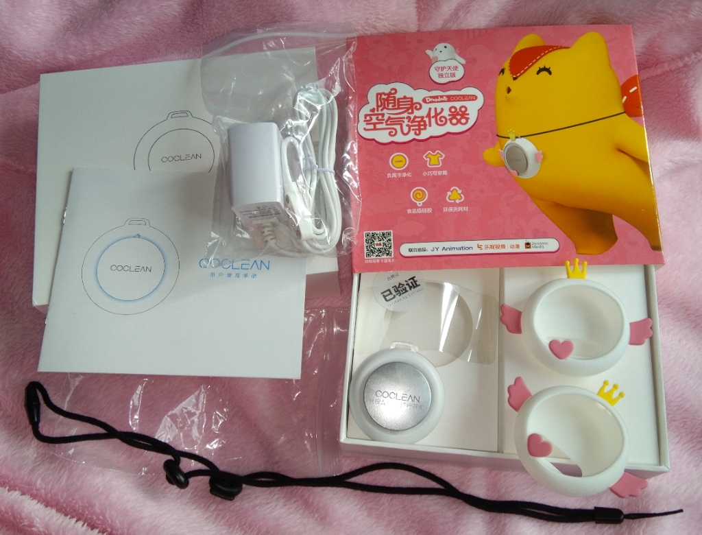 打开漂亮的包装,第一眼看到这款随身空气净化器,就让人爱不释手,非常小巧可爱,佩戴无负担。宝贝全家福,包括净化器、充电器、使用手册、两个可爱外套和挂绳,“守护每一次呼吸”。