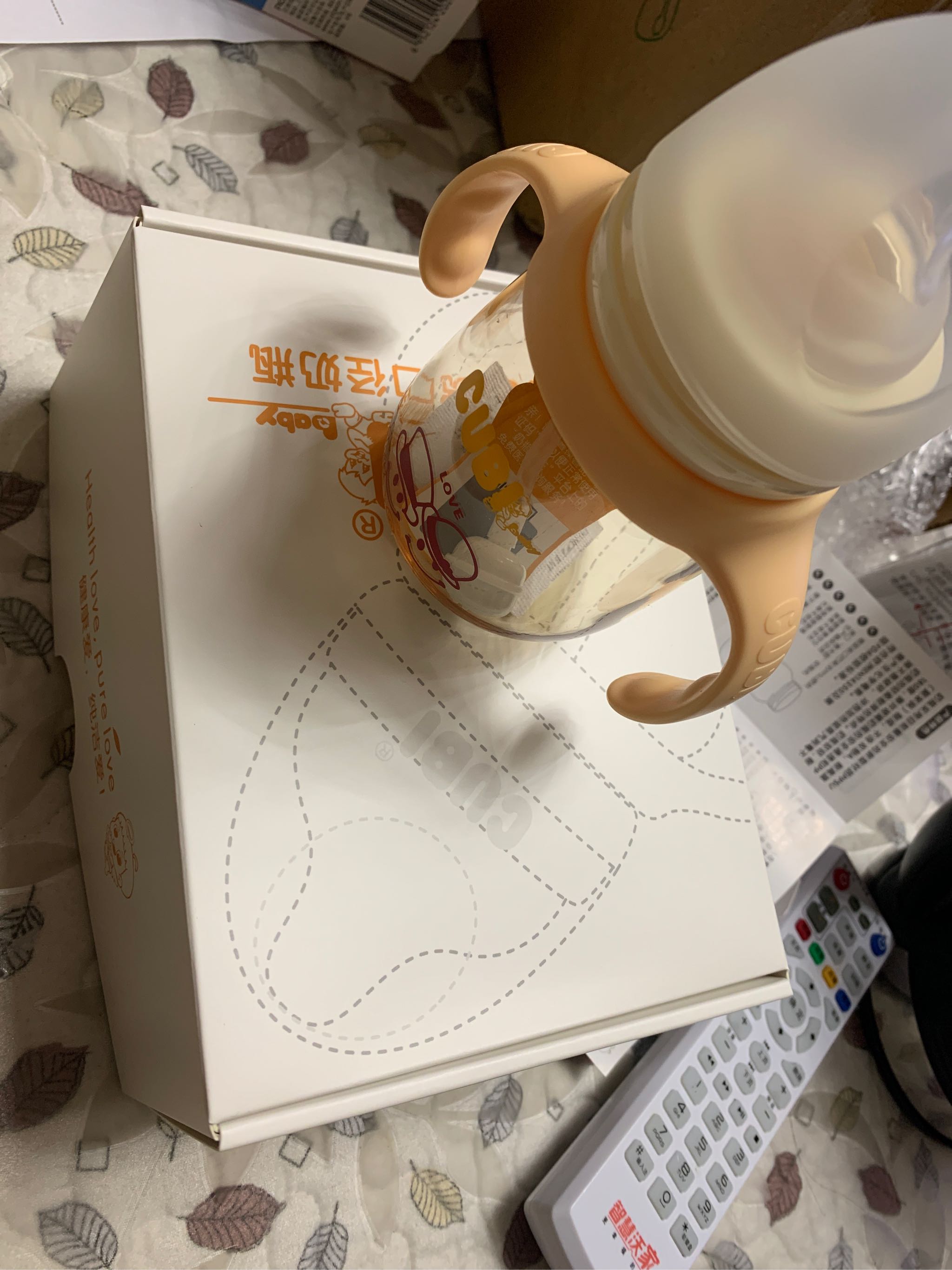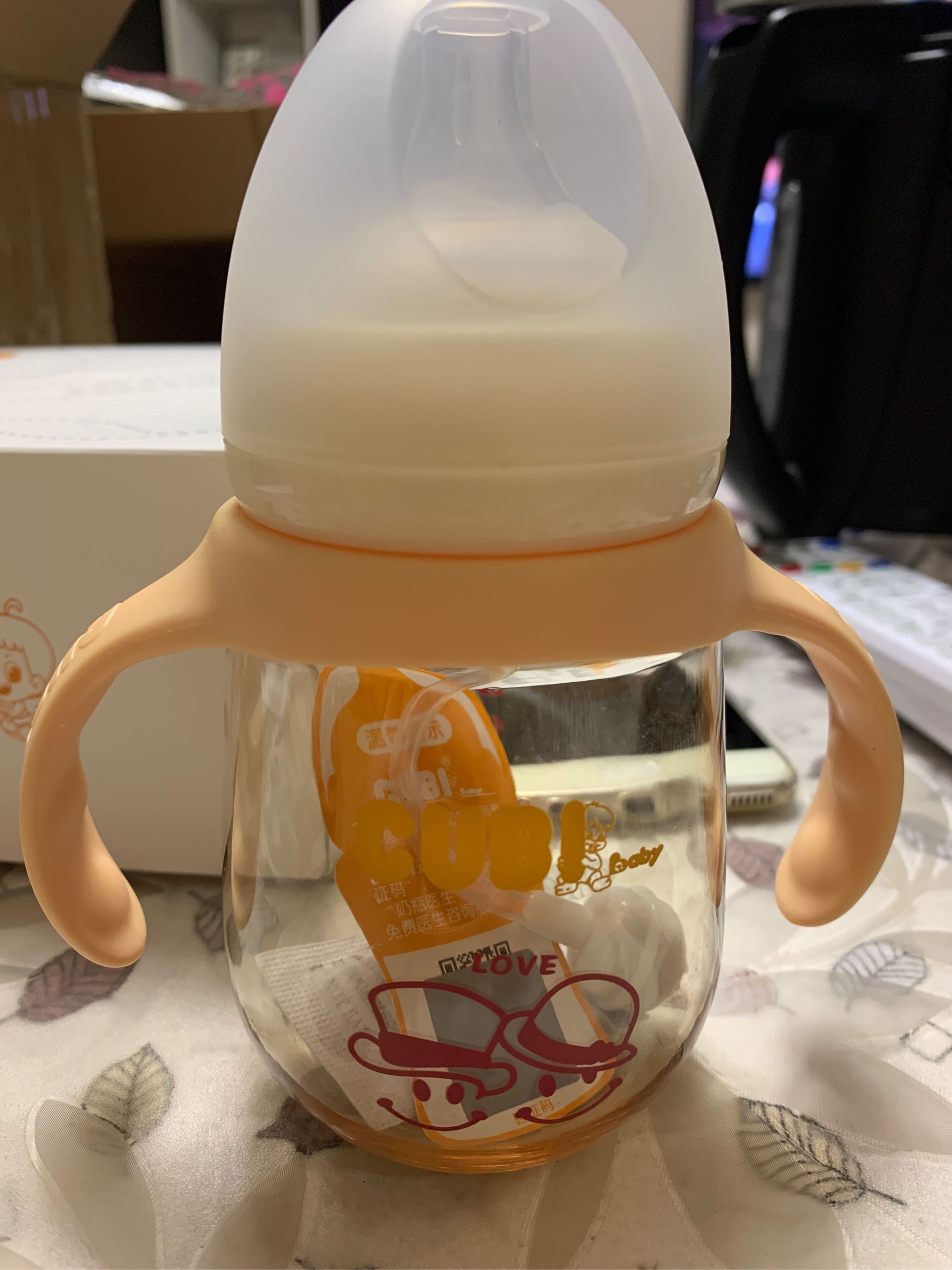 手柄设计,虽说宝宝还没出生,但可以模仿下宝宝自己抱着奶瓶喝奶的样子。还不错。