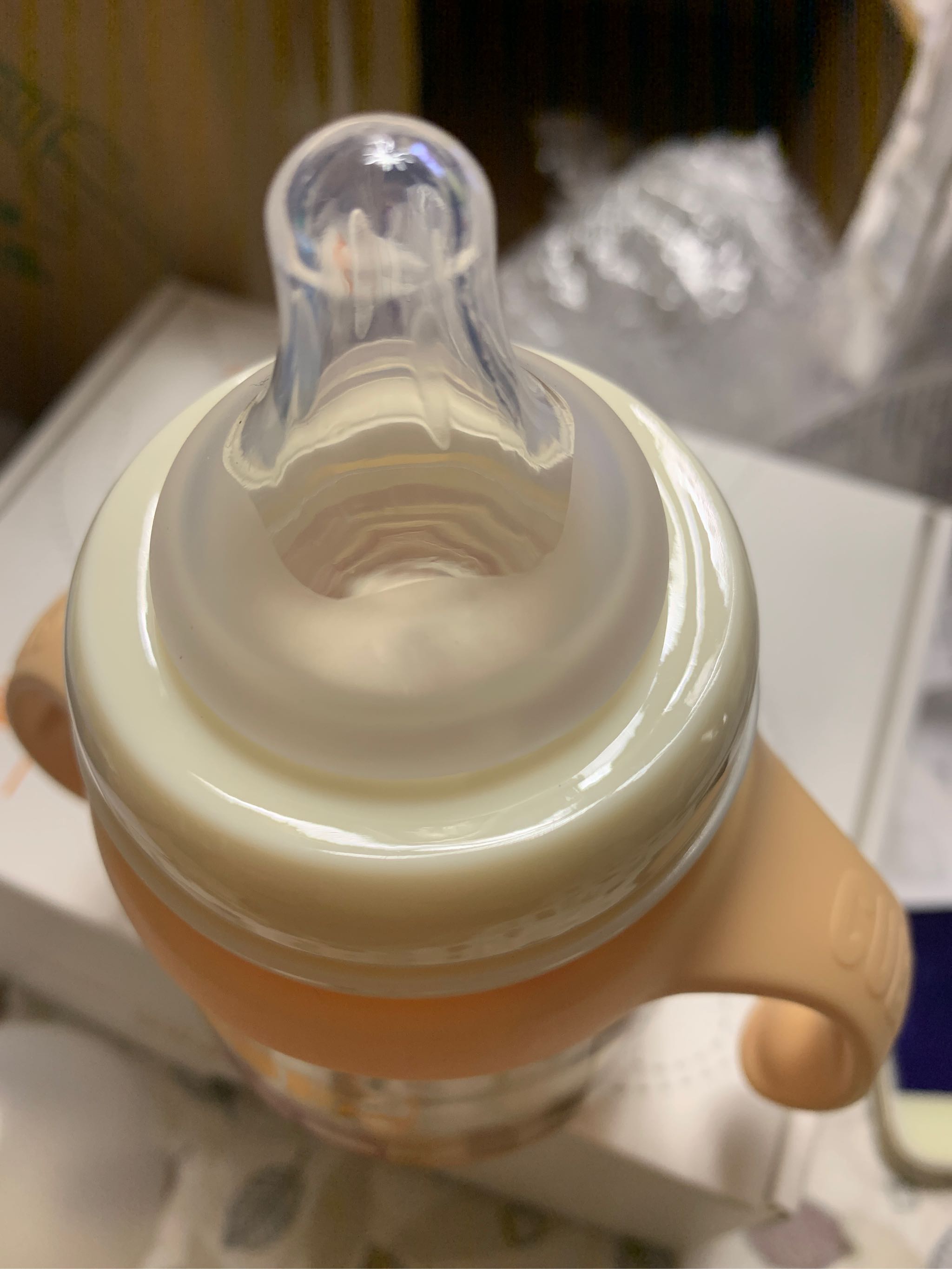 优点:奶瓶小巧可爱,有手柄设计,奶嘴比较厚实,对于喜欢嚼奶嘴的宝宝应该会比较耐用。刻度是210ml的,可以用较长时间。
