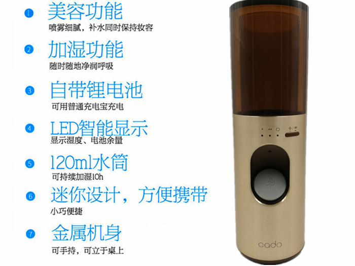 好迷你好可爱的加湿器,随身携带,随时使用。南方的冬天,湿冷天气为主,不像北方那样干燥。所以CADO加湿器到了我家,大多数时候被我拿来当补水美容仪用了,除了偶尔天太冷,家里要开暖气的时候,可以当加湿器用用。不得不说,外观真的很精致,设计也简洁大气,拿在手里就爱不释手。