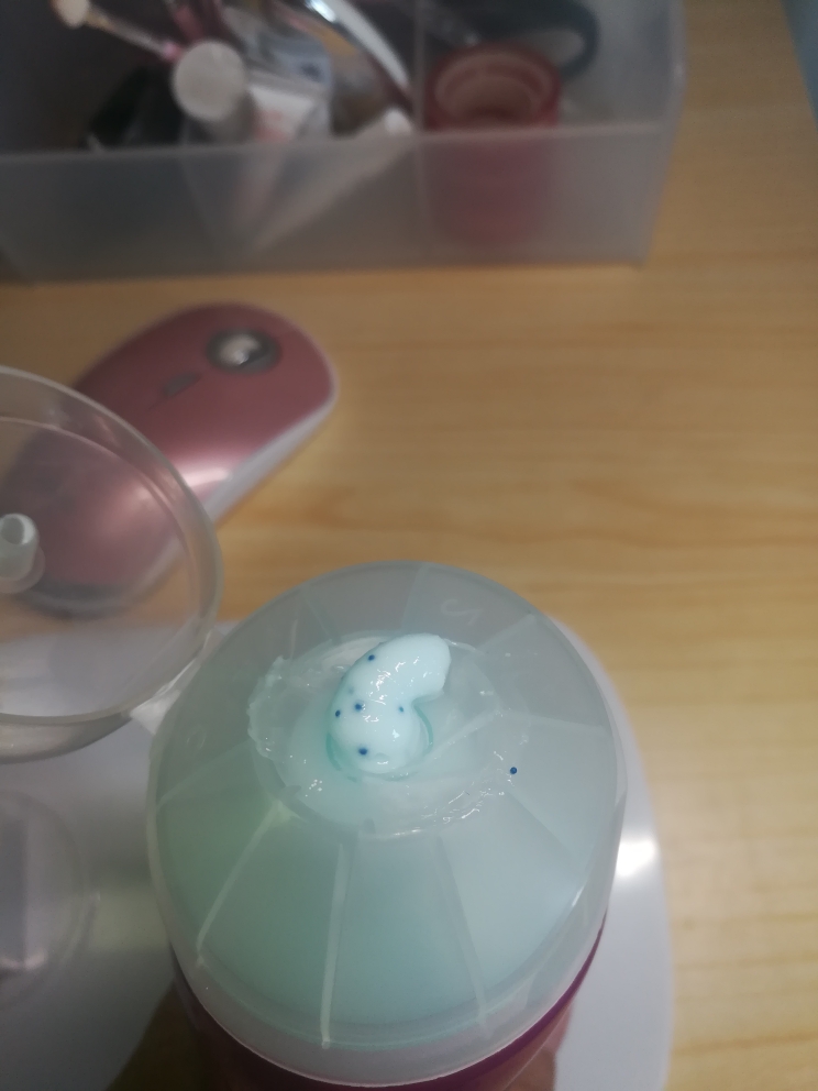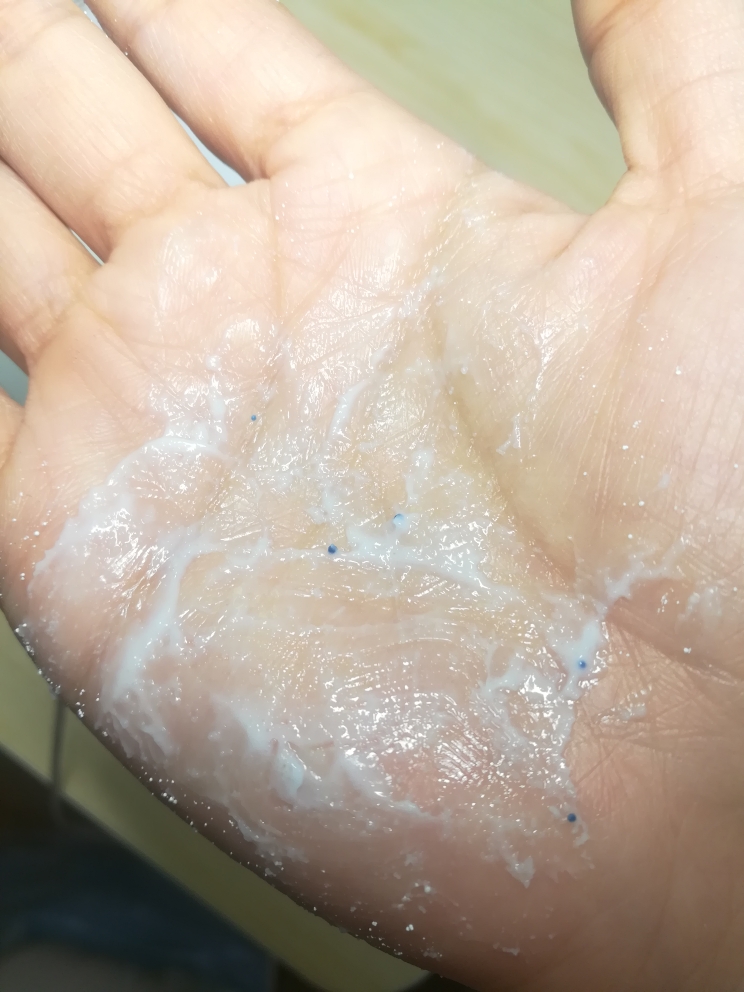 取出磨砂膏,是非常清爽水润的淡蓝色,里面有一些深蓝色和透明的小颗粒