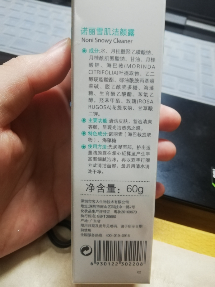 包装盒后方是关于洁颜露的具体信息,对于成分,功能描述全面,能清洁皮肤,营造干爽,适合干性皮肤使用,有亮光效果