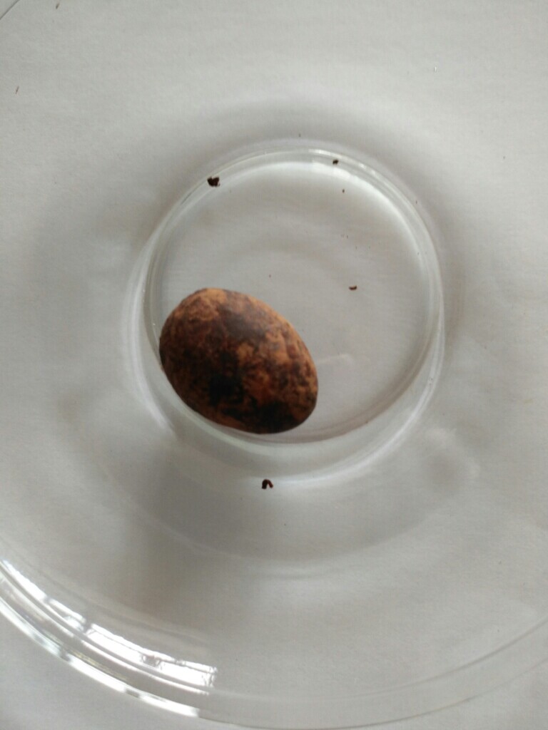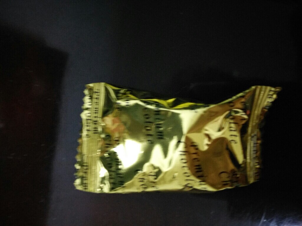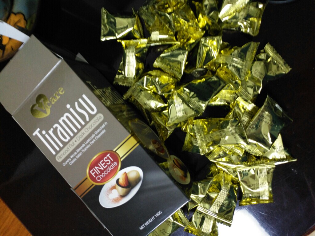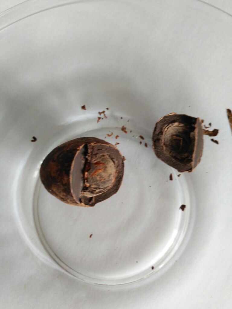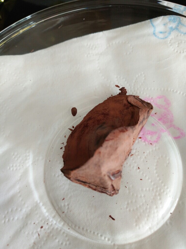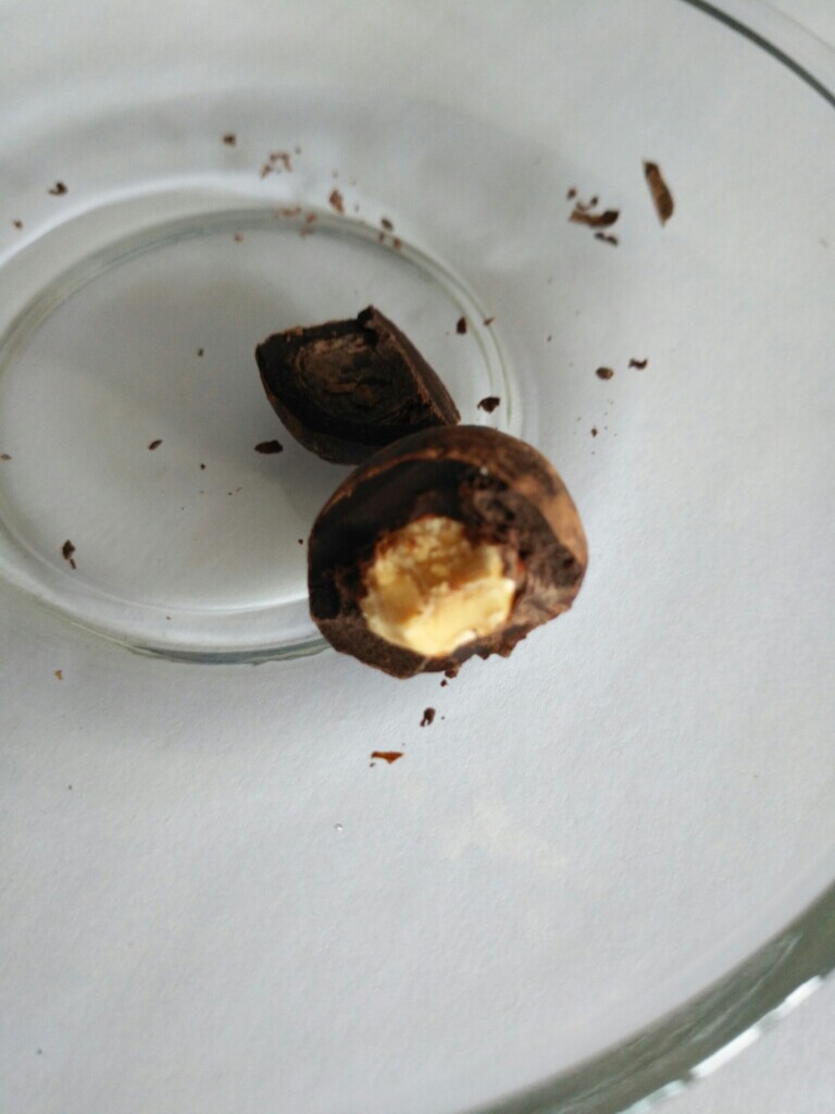 打开一粒外面裹着巧克力。外皮大概是巧克力浆裹着,可惜有点碎了。