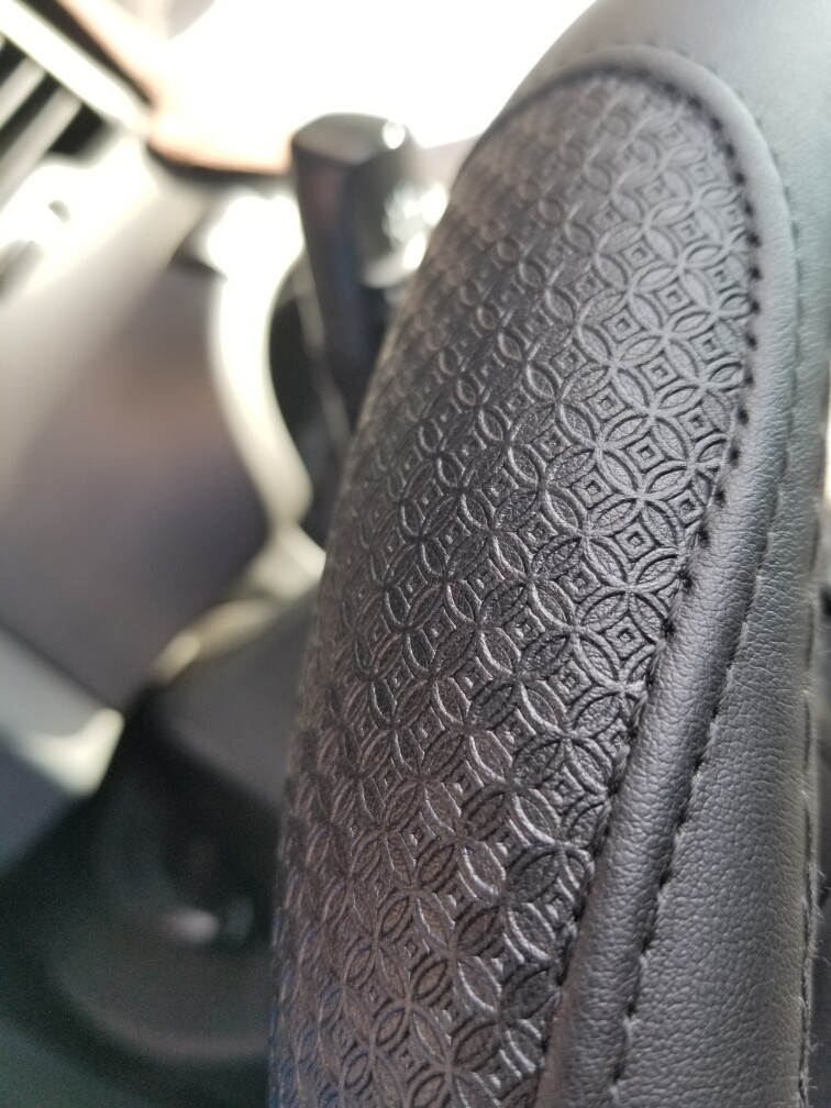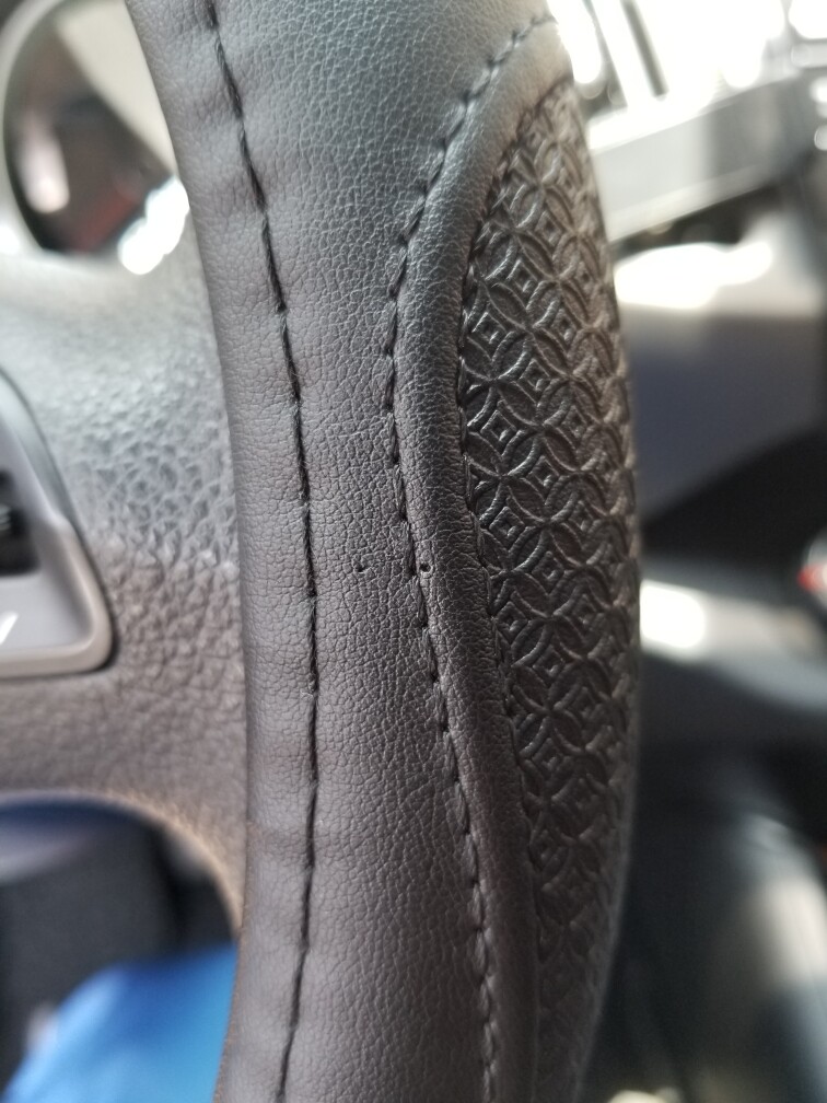 优点:方向盘捏起来很舒服,质感也很棒,细节做工也很精致,图案纹理也很清晰,线头的处理和缝合处理做的很棒,是一款很好的方向盘。