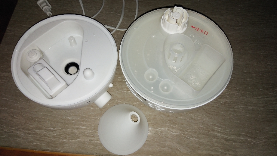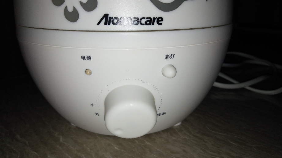 旋转开关,可以打开电源、调整喷雾大小,右上角的按钮可以开关彩灯,操作起来相当简便,也很安全。比起那种单一按钮就包含所有功能操作的机器,要好很多,我不用去记长按短按或者按两下按三下分别是什么功能,也延长了按钮的使用寿命。