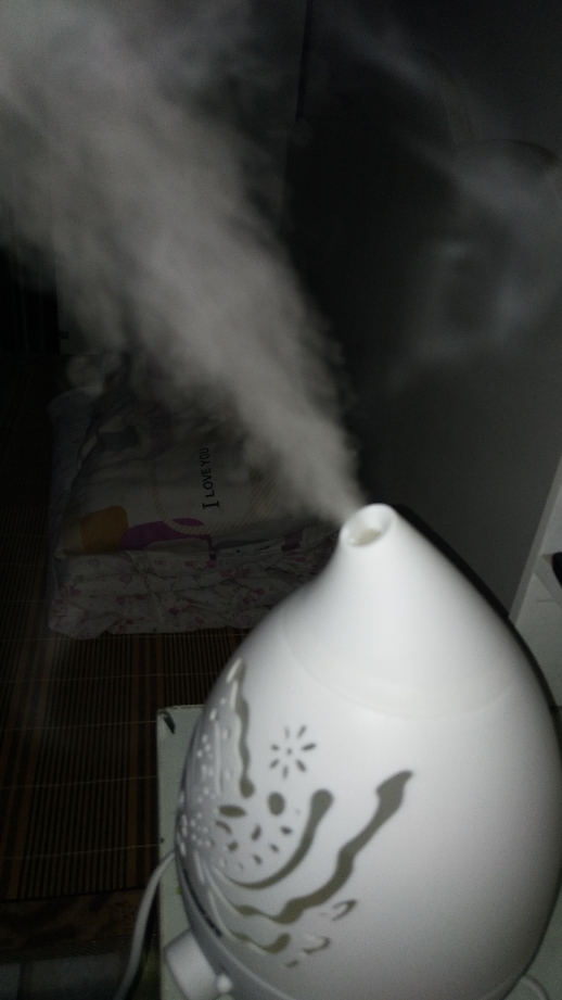 这是把开关开到最大的出雾量,我开了手机相机的闪光灯,否则无法清楚拍出喷雾的范围。其实肉眼看到的喷雾范围会比照片显示出来的更大一点,而且完全是雾,没有喷出水珠哟,很满意!