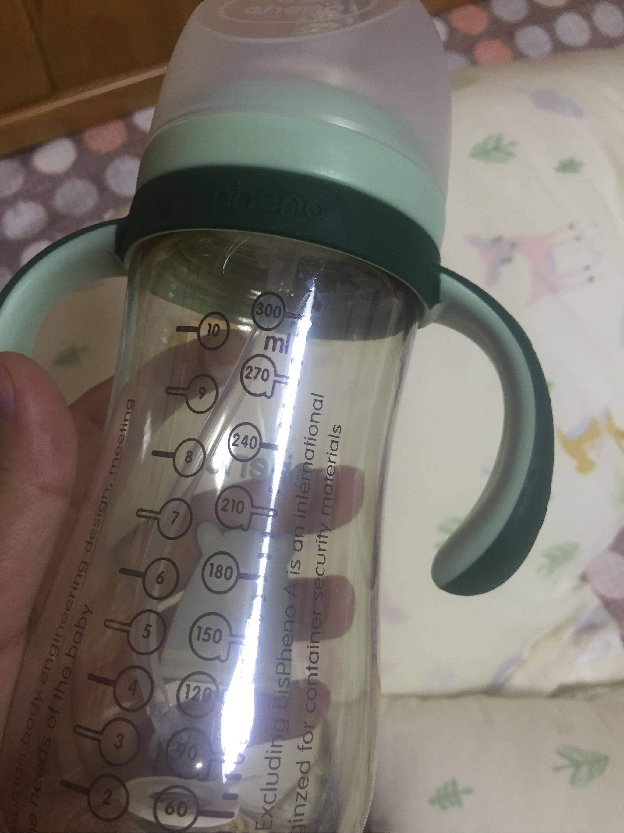 奶瓶整体很美观,因为材质的关系,跟轻便,两边有把手宝宝可以自己抓着,非常方便