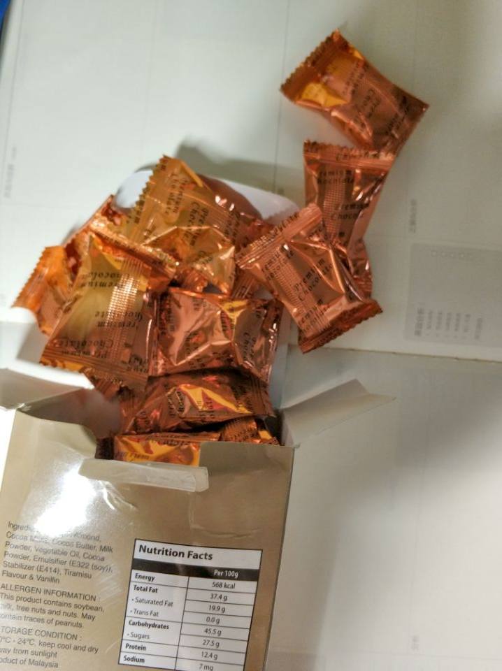 又一次试用成功了,很幸运。巧克力,我儿子最喜欢吃了。这次试用成功的是马来西亚提拉米苏口味的,纸箱包装。快递取回来,儿子迫不及待的拆箱,导致外箱没来得及拍照,直接进入主题,看产品包装。