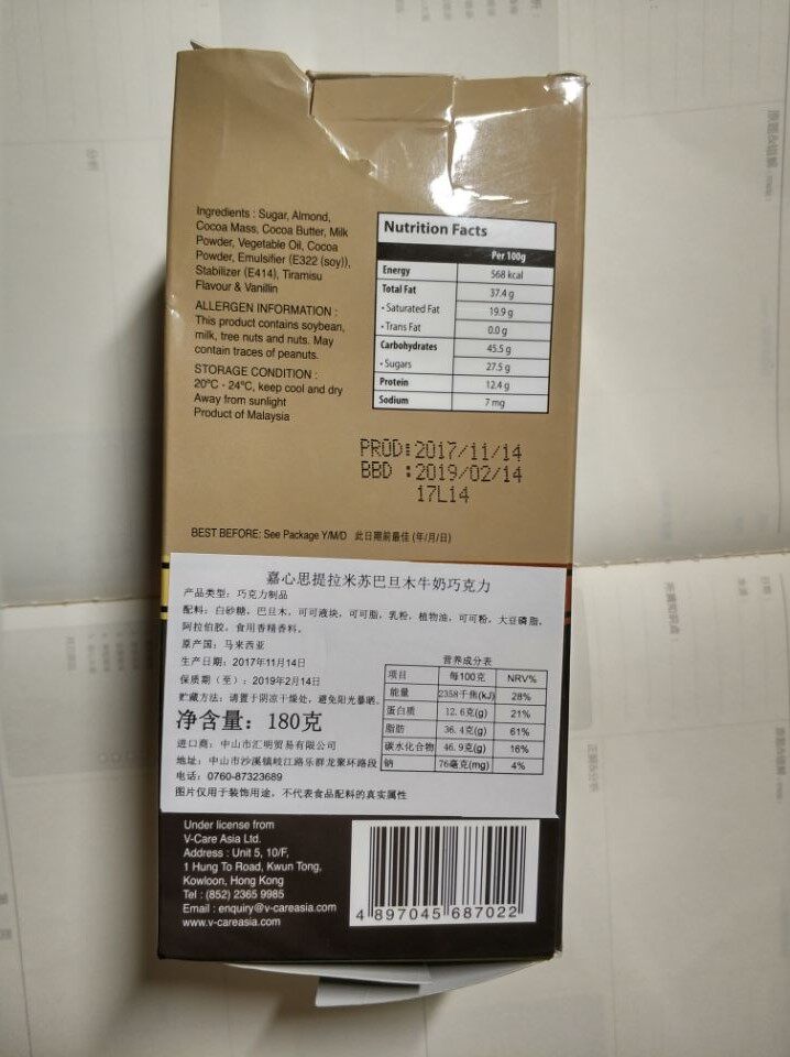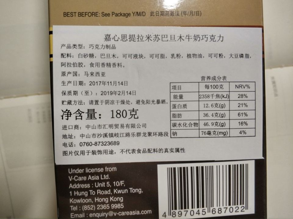 店家很细心的贴了标识,有中文说明。17年11月的生产日期,日期有些不新鲜了,好在保质期比较久,还是可以放心食用的。