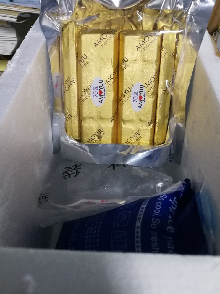 两个大冰袋个一个小冰袋,以确保巧克力在运输过程中不会融化