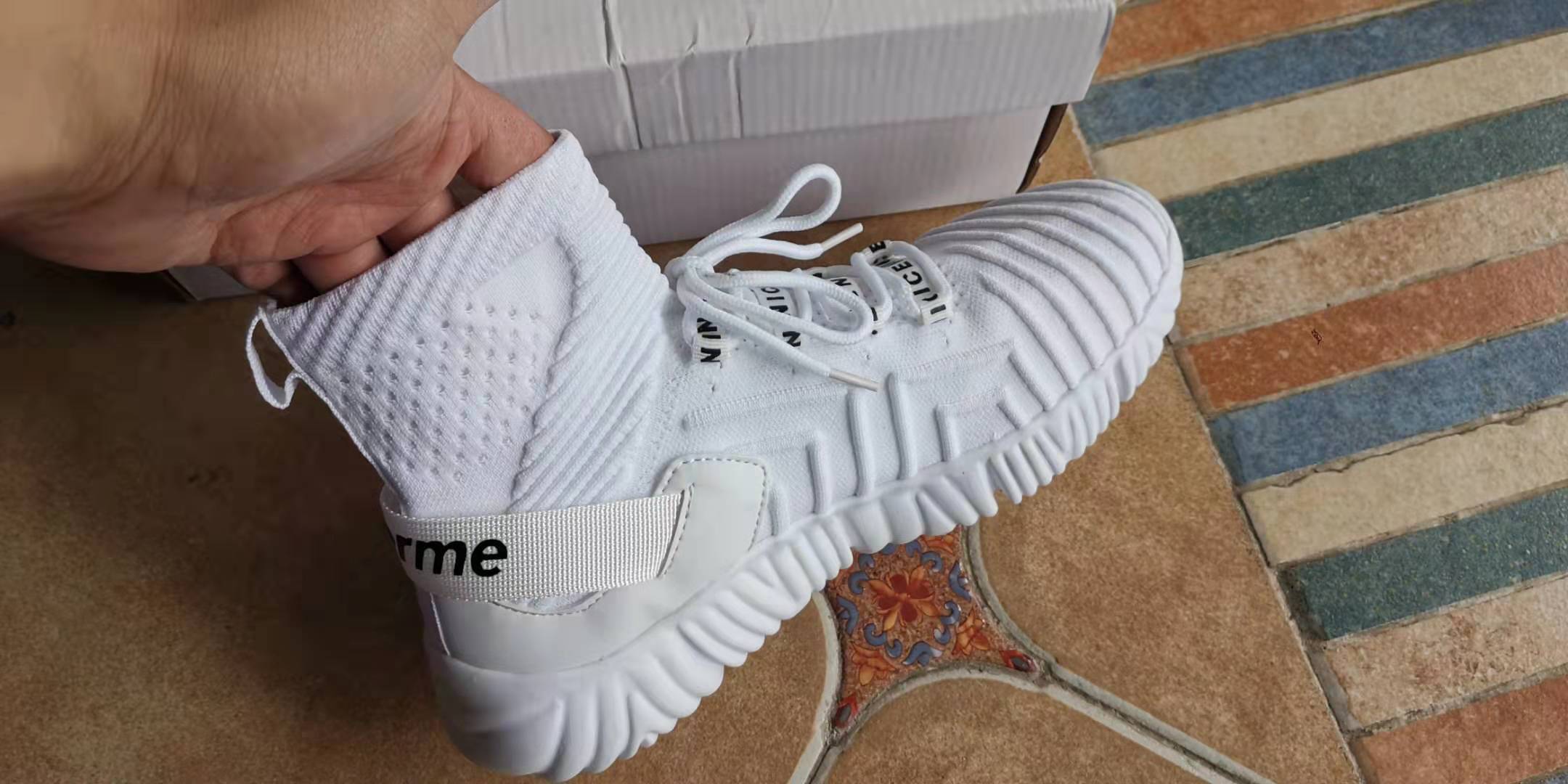 鞋子第一感觉就是潮!酷!帅!。 非常喜欢这个款式。白色的虽然不耐脏,但是好看就完事了。 面料材质挺好的,高邦的部分很有弹性,合脚,没有压迫感,很快能适应