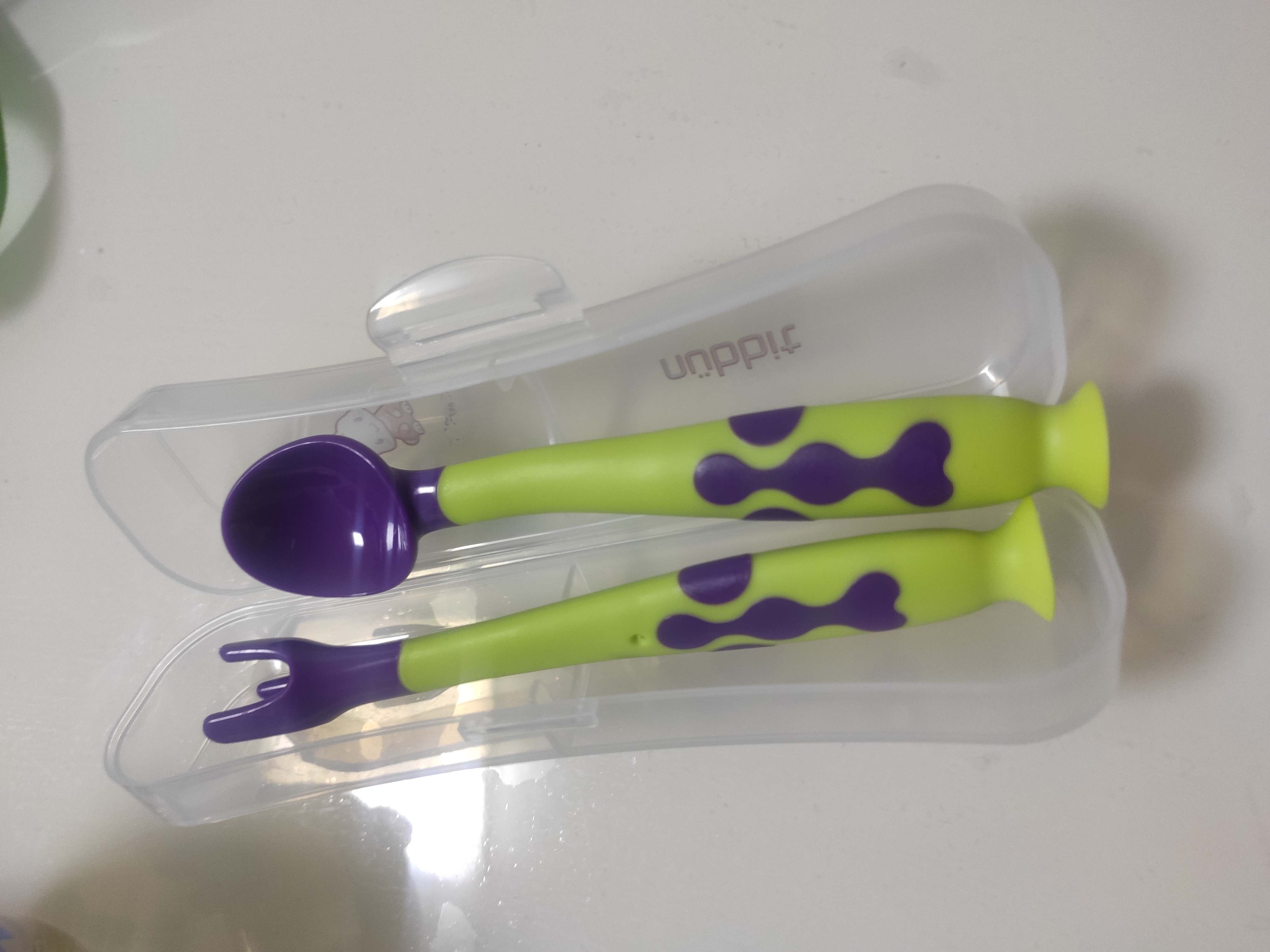 首先要说本来就打算购买的,结果中奖了,好开心。之前看了几家宝宝勺子,看到有试用就点了一下,结果中奖了呢。硅胶手柄加上pp材料的勺子和叉子头部,非常好,最主要的是可以随意弯曲,宝宝喜欢用还喜欢玩。叉子是四个插头的,叉面条之类的食物非常方便,块状的食品用起来也方便。勺子弯曲起来可以自由调节宝宝舒服的角度,用起来更方便。手柄硅胶材质的,握感很舒服,拿在手里不滑很牢靠。勺子和叉子底部还配有吸盘,这个小设计非常的贴心,清洗完后直接吸在桌面上晾干非常好。还有塑料盒子,方便携带,放在盒子里带出去也怕路途中弄脏勺子,需要使用的时候直接拿出来就可以给宝宝用上了。