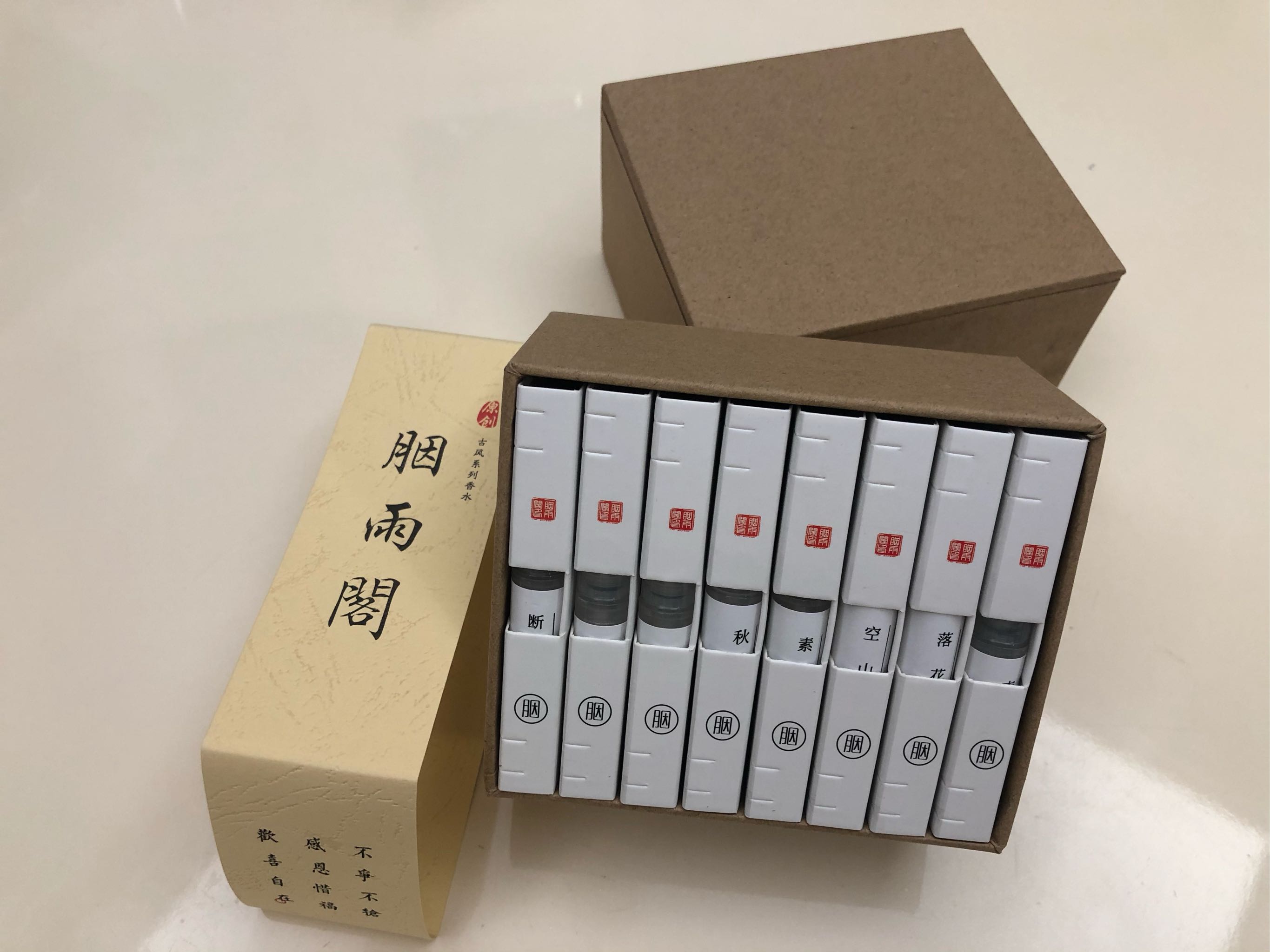 收到了香水套盒,外包装很简洁,抽拉式的盒子,很方便拿取,里面一共有八只小香水。