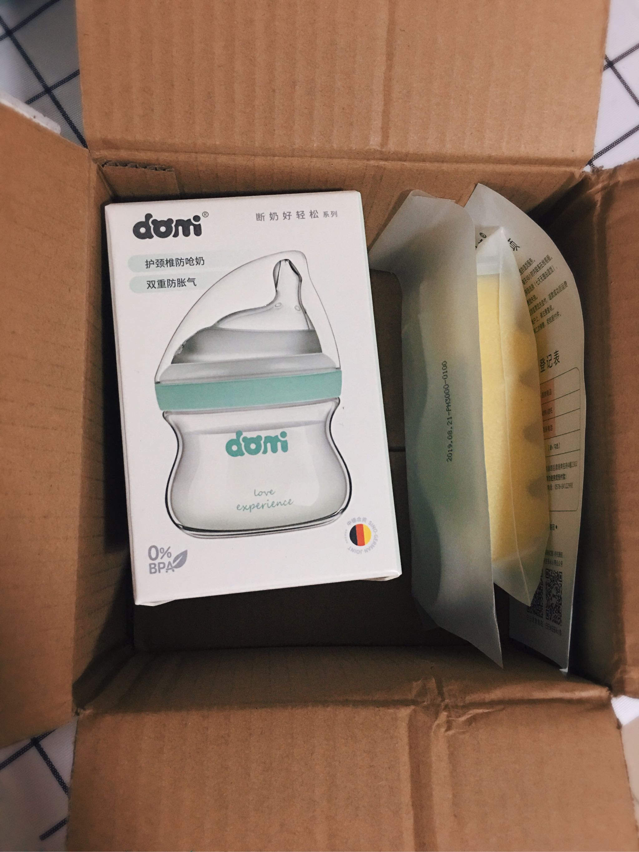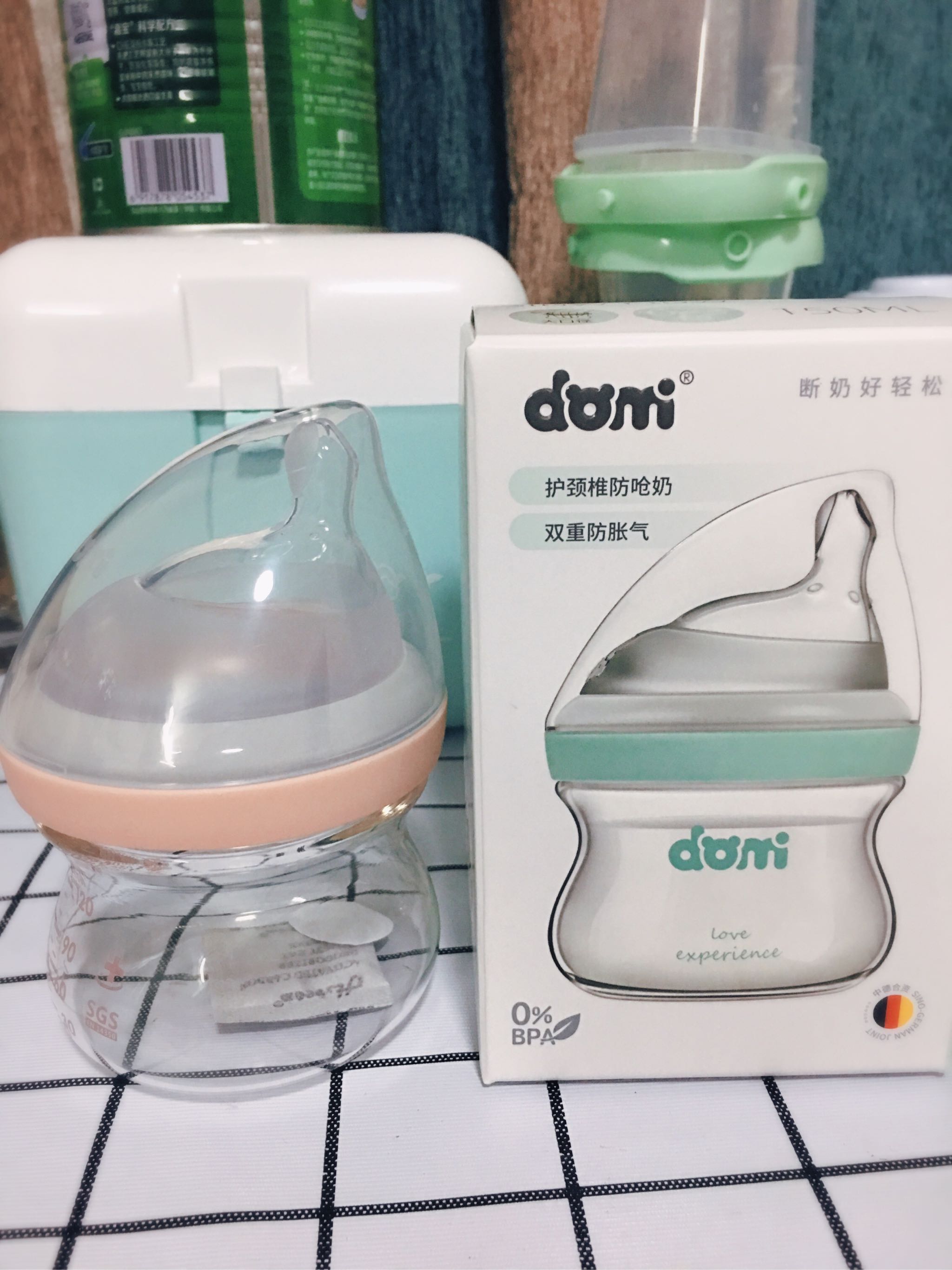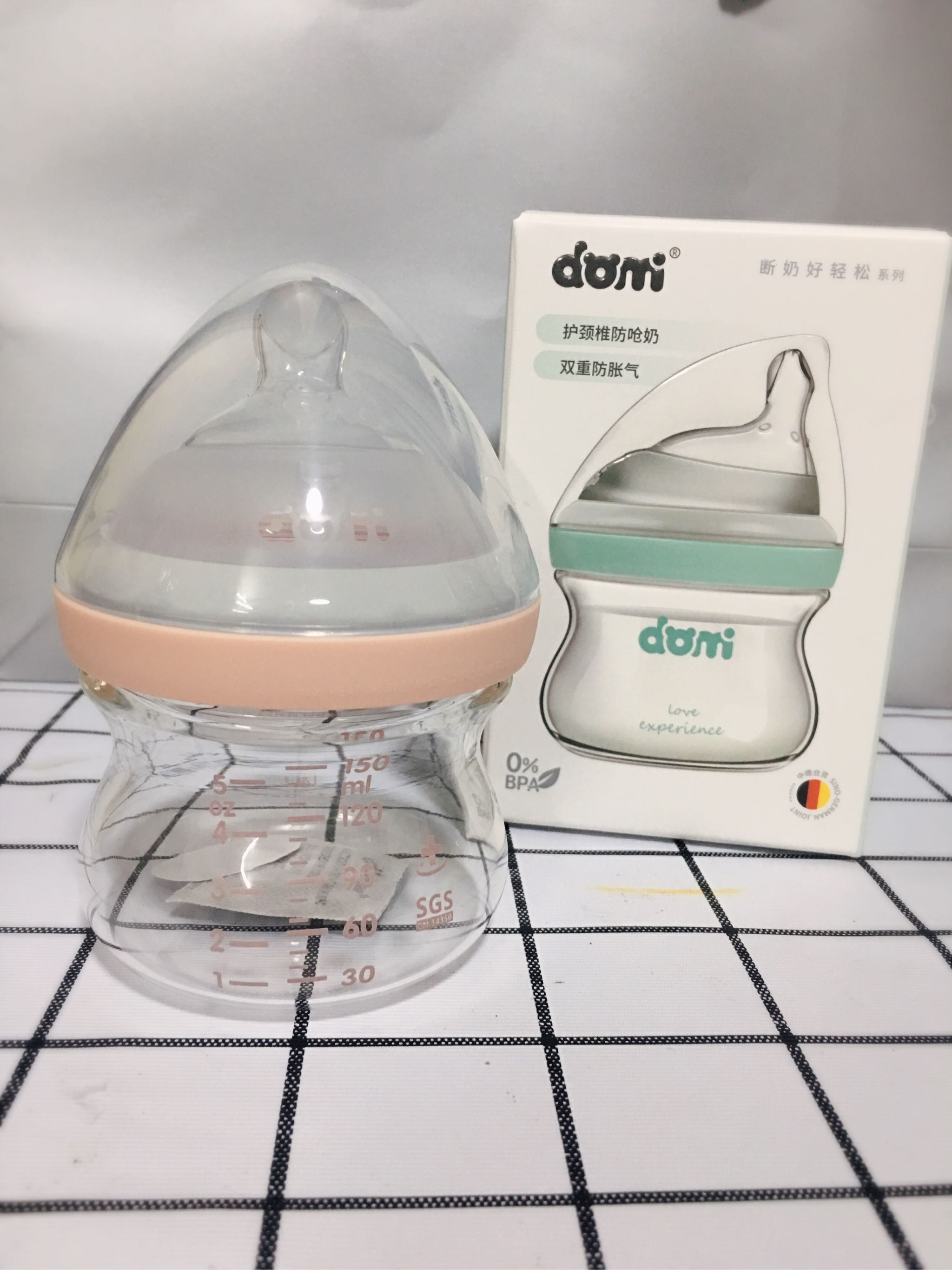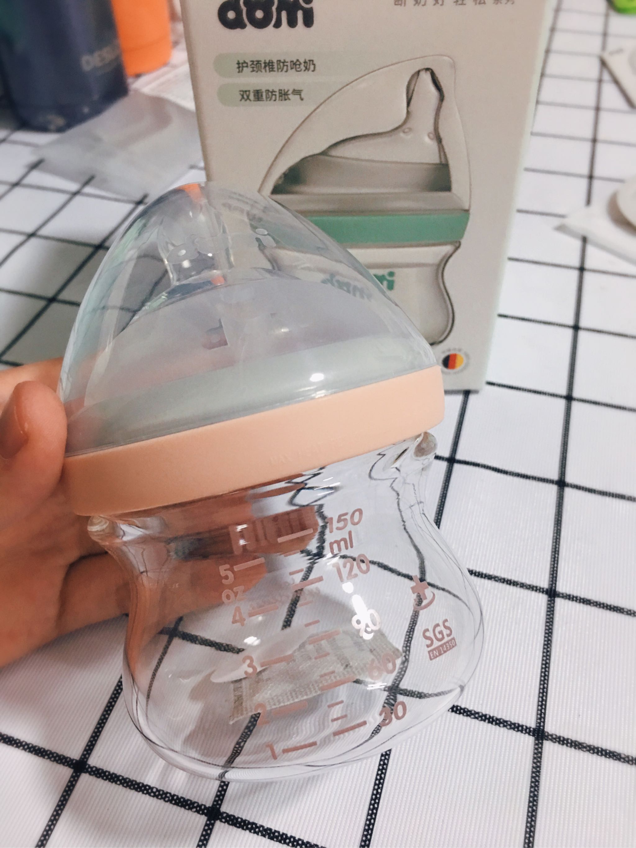 这款奶瓶是玻璃材质,可是又不会很重,家里还有一款新x怡120ml,两款相比,还是多米的要轻,而且瓶身的设计更方便抓握。