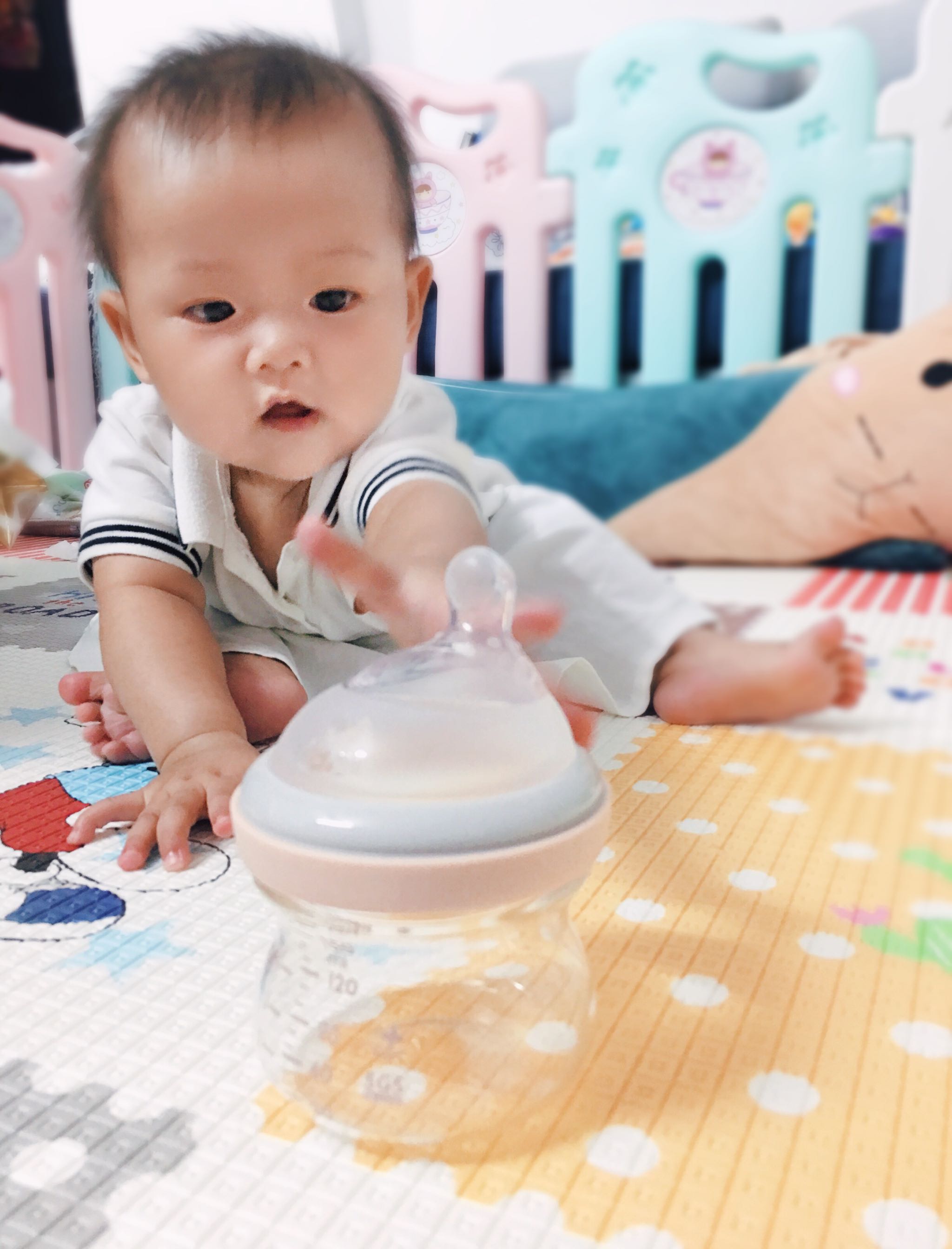 宽口径奶瓶,奶嘴的设计可以很小角度抬头就可以喝到奶,bb喝奶也不用那么累了