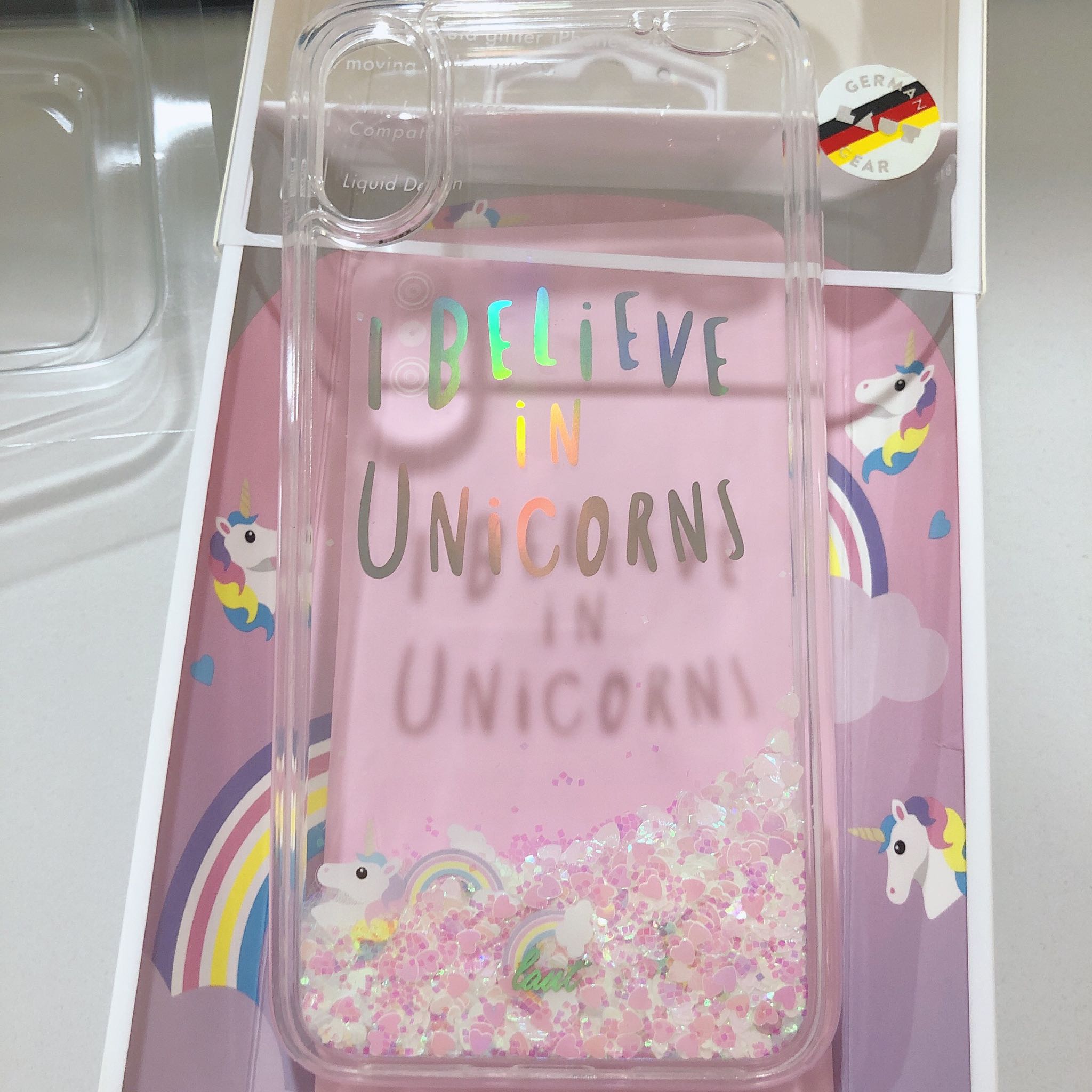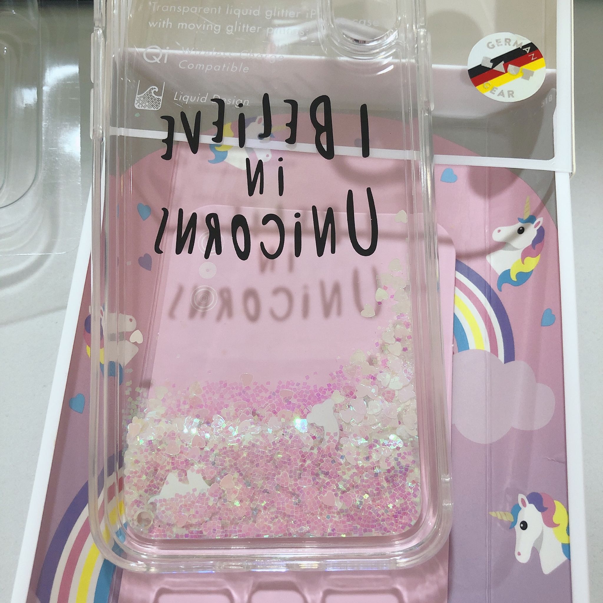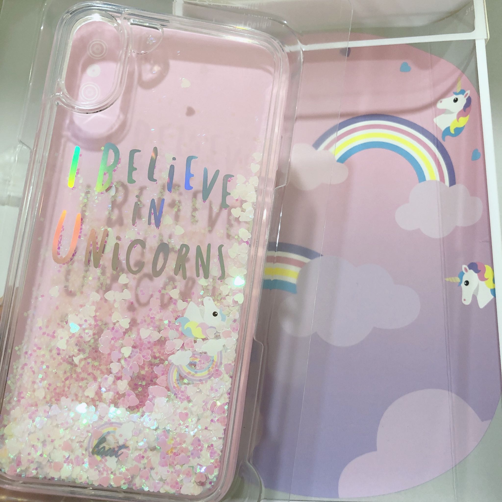 包装很好,显得手机壳挺高大上的。独角兽真的特别可爱,女生应该都喜欢的类型,粉粉的特别少女心~ 里面带有液体,并且一颗颗的小爱心随之流动,还有几只独角兽,彩虹,很好看。 所有的孔位都精准,质量不错,手感也还行。总而言之,胜在颜值!