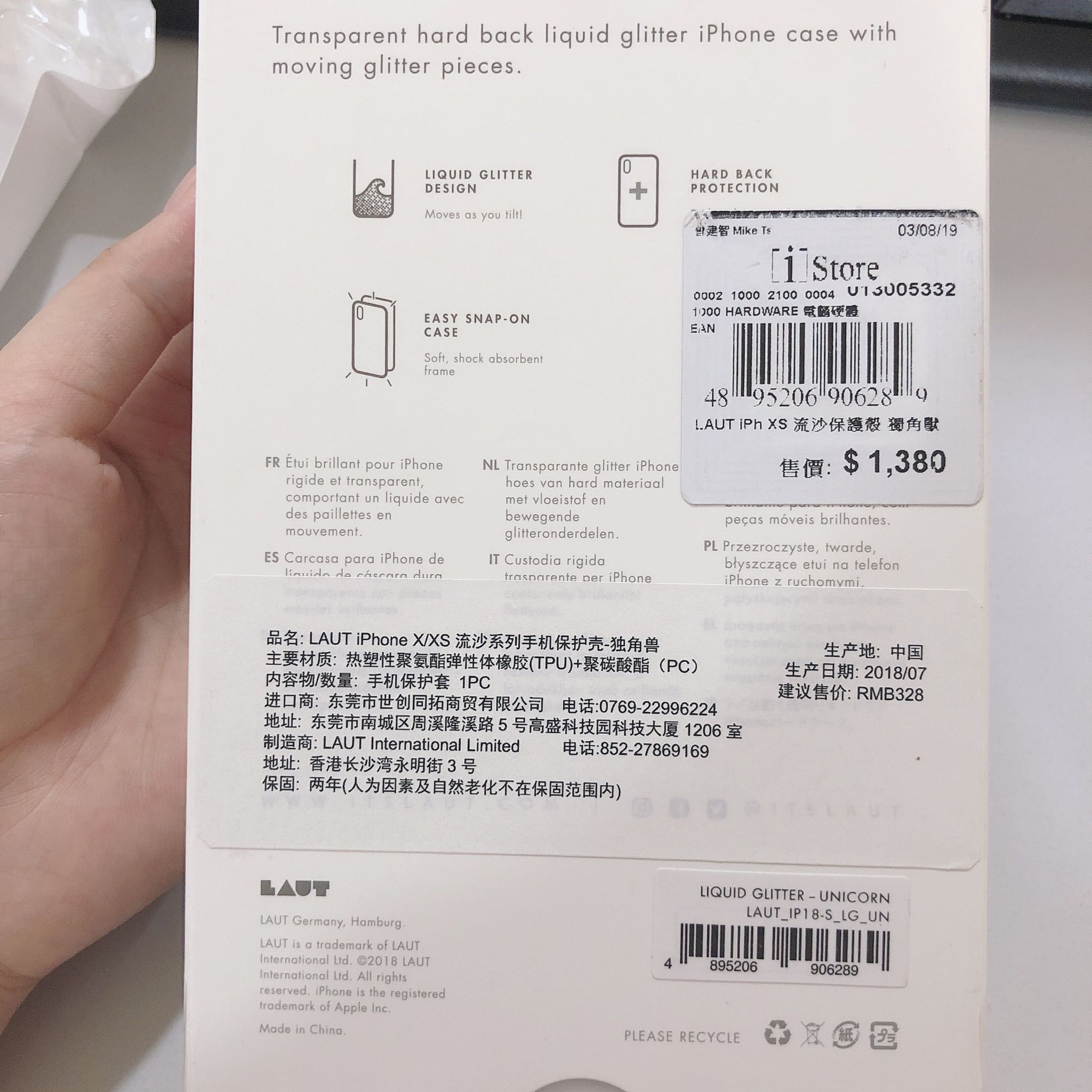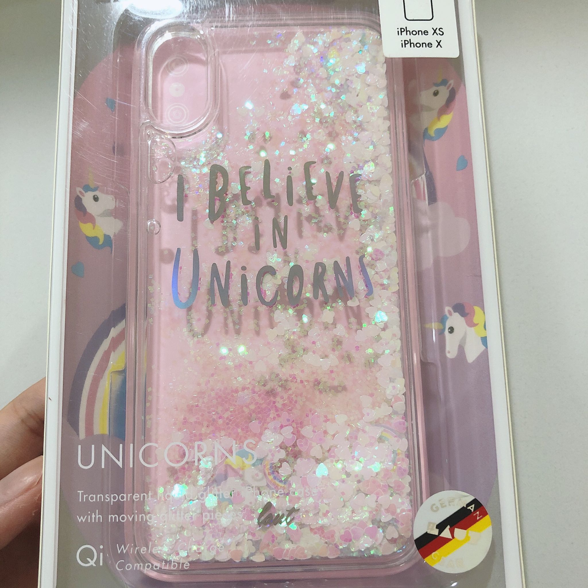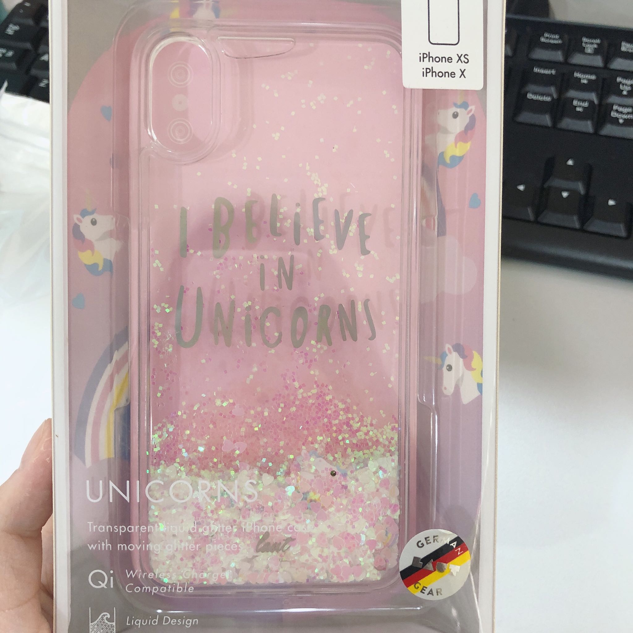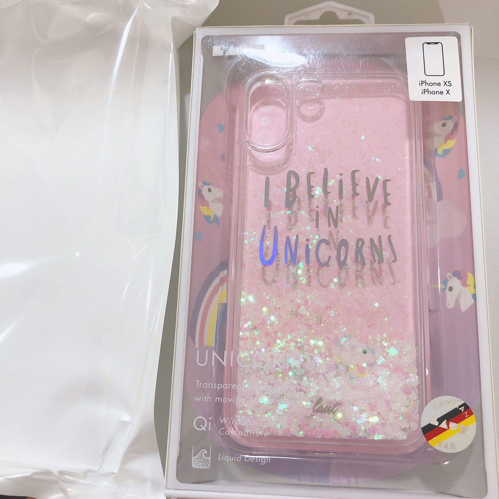 包装很好,显得手机壳挺高大上的。独角兽真的特别可爱,女生应该都喜欢的类型,粉粉的特别少女心~ 里面带有液体,并且一颗颗的小爱心随之流动,还有几只独角兽,彩虹,很好看。 所有的孔位都精准,质量不错,手感也还行。总而言之,胜在颜值!