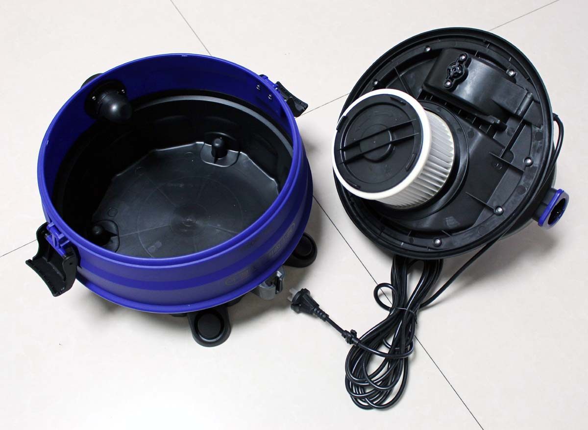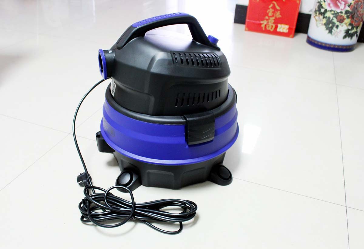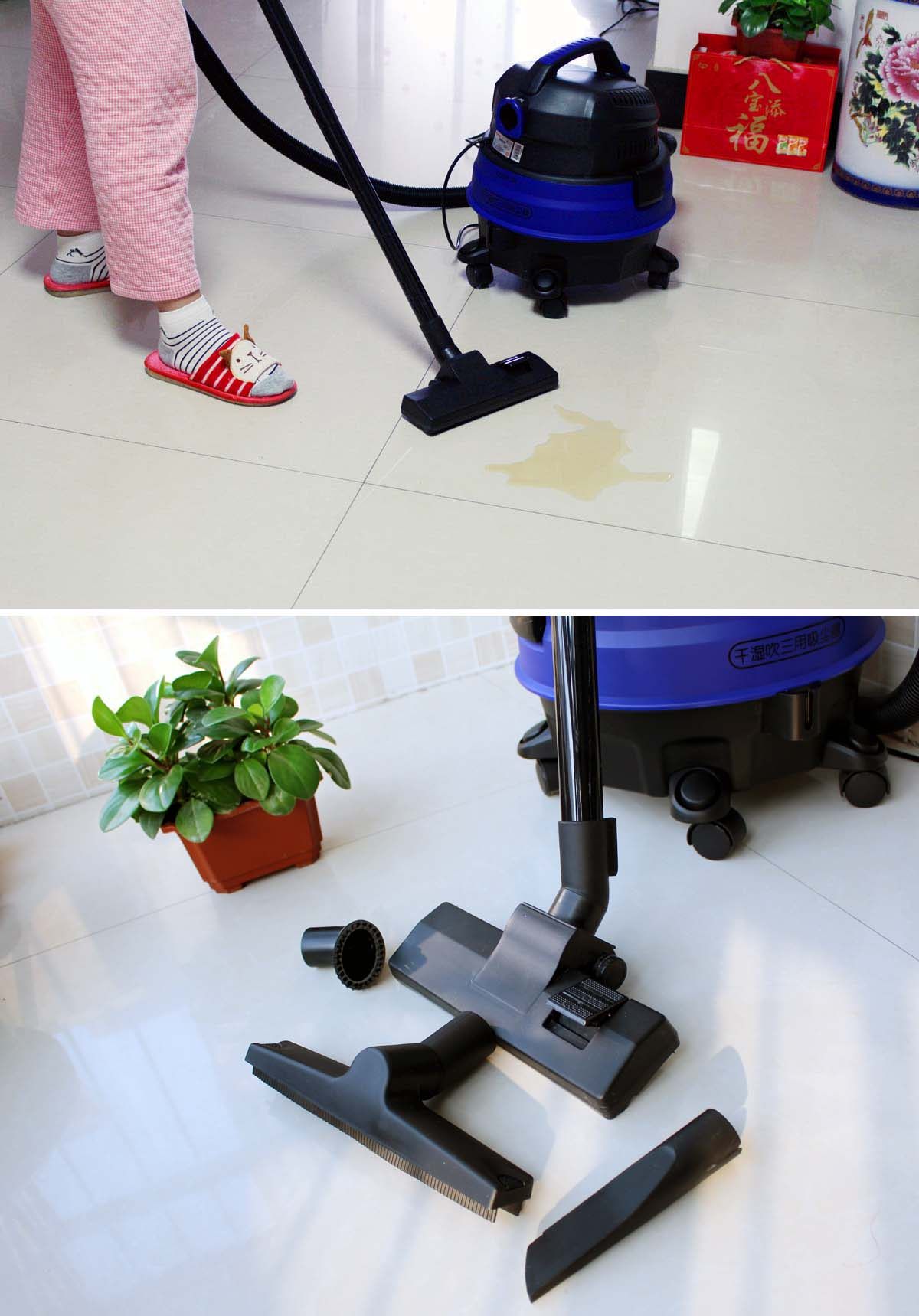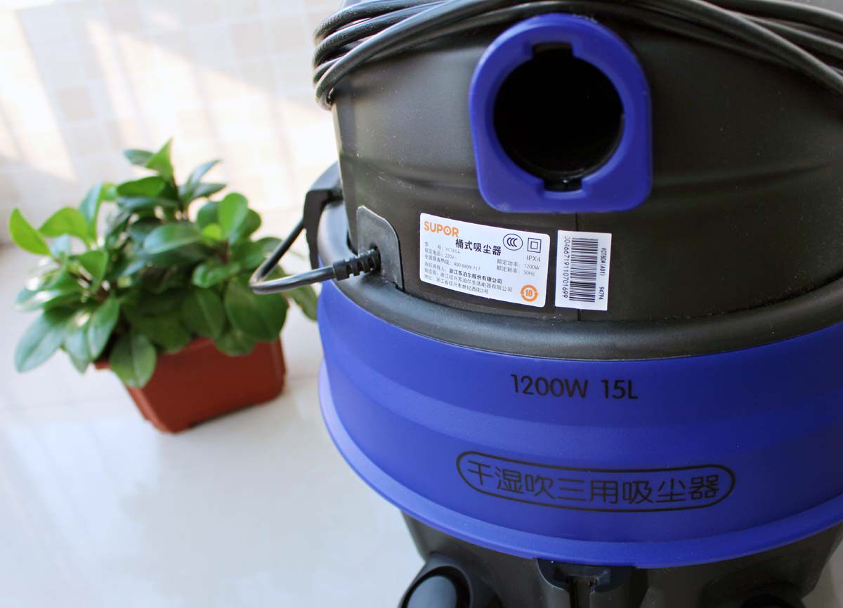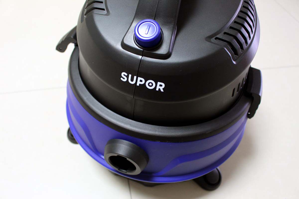 吸尘器顶部的蓝色按纽是电源开关,按下即可启动使用,再按一下即可关闭电源停止吸尘。双风道散热口,能够快速清洁,使电机的寿命更长,高效的防水设计,不怕水淋,能够很好的起到保护防止漏电作用。