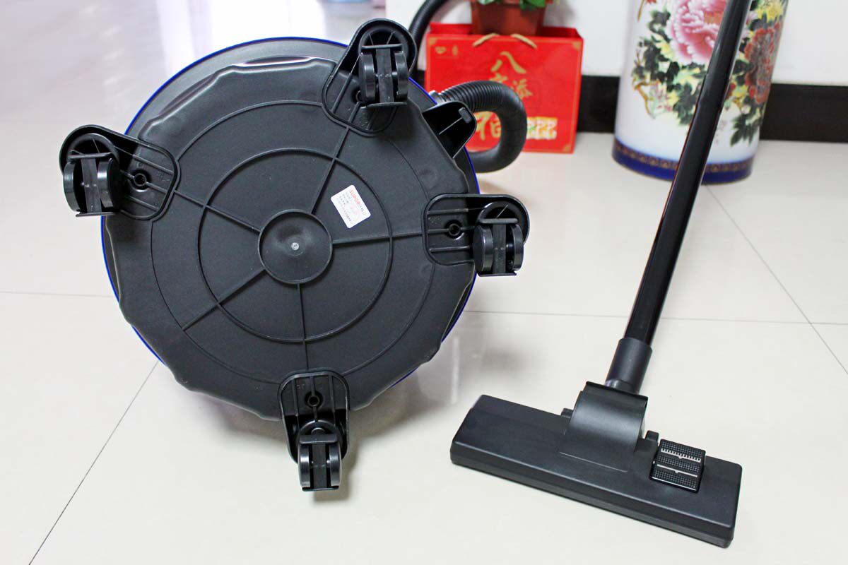 这款吸尘器设计的比较经济实用,配件有地刷、吸水刷、缝隙吸咀和一把小圆刷,延长管二节、软管一条、四个万向轮。各个组件很好安装,简易方便。主机看着个大,但轻巧不太笨重,把四个万向轮安装到底部的四个小圆孔里,便可轻松的前后左右移动。黑色软管约1.8米,可配备二节延长插管,兑接上即可,再安装上地刷便完成吸尘器的组装。