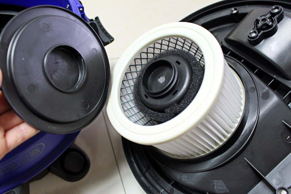 打开吸尘器,可以看到机头,HEPA滤网和盖子可以打开,内里是有一个圆筒状海绵,可以起到过滤和降噪作用。特别要提示,请勿将HEPA过滤网进行吸水操作,当需要吸水时,请务必取下HEPA过滤网,保留海绵,进行吸水操作。